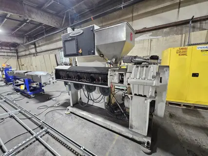 All specifications are assumed to be correct but must be confirmed by the purchasing entity.,DS Super Blue Single Screw Extruder: – 3″ (75MM) – double reduction gearbox – Air cooled – Control panel mounted on base – Electrical requirements: 460V, 3Ph, 60Hz – Barrel heaters: 460V, 1 Ph, 7,000 Watts – Barrel blowers: 230V, 1 Ph, 60 Hz – Head heater zones: 230V, 1 Ph – Maximum safe operating pressure: 10,000 – PSI, 700 KG/CM2 – Maximum safe operating temperature: 600F All specifications are assumed to be correct but must be confirmed by the purchasing entity.,BPM Bay Plastics Machinery WBX1210-15 Waterbath: All specifications are assumed to be correct but must be confirmed by the purchasing entity.,Electrical requirements: 460V, 3Ph, 60Hz Full load amp: 3.67 Dimensions: 12” W x 10” D x 15’ L Hold down bars: 4 All specifications are assumed to be correct but must be confirmed by the purchasing entity.,The water baths are specifically designed for stand pelletizing also include locking quick-releasing hold-down bars to keep your strands running straight and even. The 2” diameter rollers on these bars are grooved to keep the strands aligned, and are made of UHMWPE (Ultra-High-Molecular-Weight PolyEthylene), which reduces friction between the roller and the strands. All specifications are assumed to be correct but must be confirmed by the purchasing entity.,BPM Bay Plastics Machinery EVAK-06 Vacuum Air Knife: All specifications are assumed to be correct but must be confirmed by the purchasing entity.,The EVAK series vacuum air knife is not only designed to remove water from the strands, but control the water after it has been removed. A conventional air knife only blows the water off the strands, whereas the EVAK uses vacuum induced airflow to aid this removal. The specially designed cyclone separation system removes the water from the air and collects it before draining the water through a check valve. This water can then be reclaimed and re-used in the system. All specifications are assumed to be correct but must be confirmed by the purchasing entity.,– Operating voltage: 460V/3Ph/60Hz – Useable Nozzle Width: 5 inches (127mm) – Max strang count: 16 (Max Strand Count For 1/8″ (3mm] Diameter Strands, Count May Vary w/ Strand Diameter) – Standard strand centerline spacing: 0.375 inches (9.5mm) – Rated strand velocity: 200 ft/min (60 m/min) – Tilting vacuum head range (+/-): 22.5 degrees – Blower connection: direct coupled – Vacuum rating: 28 in-H2O (70 mbar) – Airflow at vacuum rating: 194 CFM (230 – Blower power: 2.7 HP (2.05 kW) All specifications are assumed to be correct but must be confirmed by the purchasing entity.,BPM Bay Plastics Machinery SB100 pelletizer: All specifications are assumed to be correct but must be confirmed by the purchasing entity.,Designed for a larger lab or small production line, the SB Series of strand pelletizers is capable of running constantly and consistently, yet is also suitable for less intensive lab trials. All specifications are assumed to be correct but must be confirmed by the purchasing entity.,– Easy Access: No tools required to open the exterior cutting chamber cover. – Safety: A unique interlock system prevents one’s ability to bypass the switch with a simple bolt or pen. – Maintainability: Our design is rugged and easy to clean. – Feed Table: This machine is supplied with removable feed table assembly. – Upper Feedroll: With a simple design, the upper roll remains parallel to the lower feedroll while multiple strands are being processed, resulting in a uniform pulling force on all strands – Pulling Force: Large pneumatic cylinder and upper roll design this unit out performs all others in its class. – Pneumatic Cylinder: This cylinder is a large 2 1/2” bore and located on the cover for optimal pulling force and conveniently swings away for cleaning. – Push-Pull bed knife adjustment – Eccentric mounted bearings for lower feed roll gap control – Four-edged, solid tungsten-carbide bed knife – Stellite-tipped rotor – Diamond-knurled lower feedroll – Hypalon-covered upper feedroll – AC variable frequency drive – Stainless steel cutting chamber – Aluminum cover assembly and aluminum top plate – Removable Discharge Chute & Push-Pull Bed – Knife Gap Adjustment – Clean & Simple design – Easily removable infeed chute for thorough cleaning All specifications are assumed to be correct but must be confirmed by the purchasing entity. |