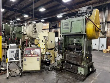 MODEL.........................: P2-75-42 TONNAGE.......................: 75 TON STROKE........................: 2.5" ADJUSTMENT....................: 1" SHUT HEIGHT...................: 15" STROKES PER MINUTE............: 80 - 350 VARIABLE BED SIZE......................: 42" L - R X 31" F-B EQUIPPED WITH: WINTRIS SMART PAC DIE PROTECTION CONTROL |