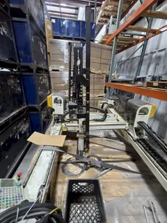 All specifications are assumed to be correct but must be confirmed by the purchasing entity.,The Sterling SR-SB-1200 is an industrial 3-axis Cartesian gantry robot engineered for pick-and-place, load/unload, and light assembly operations. Designed for integration in injection molding, packaging, or parts handling environments, it features linear rail movement across X, Y, and Z axes with pneumatic control on the vertical stroke and pendant-based operator control. The complete setup includes controller, pendant, and all cabling. All specifications are assumed to be correct but must be confirmed by the purchasing entity.,Key Features and Specifications -Robot Type: Cartesian Gantry -Axes: 3 (X, Y, Z) Linear Travel -Z-Axis: Pneumatically actuated -Drive Type: Likely stepper or servo + air assist -Control: Hardwired controller (ID: DPM0439) + pendant -Teach Pendant: Membrane-style interface with selector knobs -Power Requirement: 220V, 1PH, 60 Hz -Air Supply Requirement: 80 PSI -Mounting: Fixed gantry frame with pallet brackets -Applications: Pick-and-place, packaging, mold tending, unloading -Construction: Steel gantry frame, rigid cable supports -Included Accessories: Cabling, controller box, air lines, pendant, screen bag All specifications are assumed to be correct but must be confirmed by the purchasing entity. |
