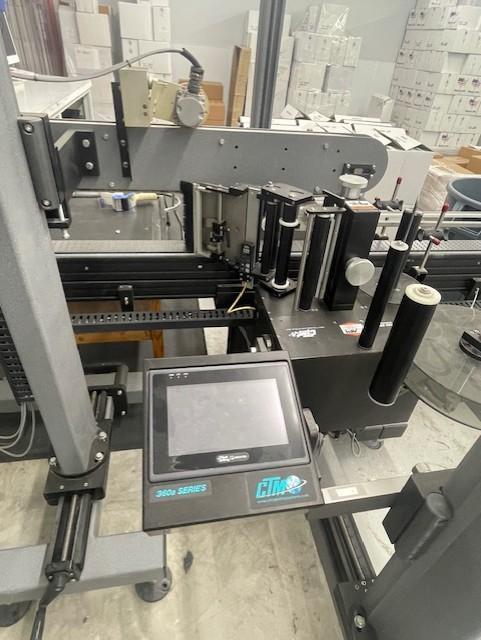 All specifications are assumed to be correct but must be confirmed by the purchasing entity.,This is a fully integrated CTM 360a Series print-and-apply labeling system, equipped with a tamp or tamp-blow applicator, synchronized conveyor, and Allen-Bradley interface controls. The system is designed for inline labeling of cartons, bottles, or flat-sided containers at moderate to high speeds with accurate label placement. Unit is powered by a 115V single-phase input and features dual control zones via Weintek touchscreen and AB safety console. All specifications are assumed to be correct but must be confirmed by the purchasing entity.,Specifications & Features -Label Application Mode: Tamp-Apply or Tamp-Blow (configurable) -Controller: Allen-Bradley HMI + Weintek touchscreen -Label Roll Capacity: 12″ OD rolls (est.), 3″ core -Web Width Capacity: Up to 6.5″ (standard for 360a) -Placement Accuracy: ±1/32″ with sensor-driven indexing -Throughput Capacity: 30–60 products/min (application dependent) -Power Requirements: 115V, 5A, 50–60Hz -Drive Configuration: Motorized conveyor with integrated label feed roll -Construction Stainless + powder-coated steel frames -Frame/Stand Info: R.L. Craig RLC4100-3-14 (adjustable mounting system) -Safety Features: Emergency stop, guarded motion zones, lockout-capable -Footprint (Est.): ~10 ft total line length including conveyors All specifications are assumed to be correct but must be confirmed by the purchasing entity. |