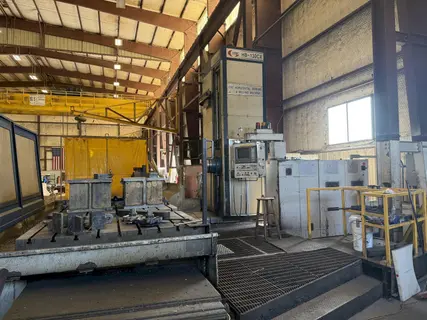 STROKE: X AXIS: 157" Y AXIS: 90" Z AXIS: 51" W AXIS: 27.5" DISTANCE FROM SPINDLE NOSE TO CENTER OF TABLE: 30" - 80" DISTANCE SPINDLE CENTER TO TOP OF TABLE: 0 - 90" TABLE: DIMENSION: 63" X 157" ROTARY TABLE DIMENSION: 63" X 63" ALLOWABLE LOAD: 33,000 LBS. ROTARY TABLE ALONE: 22,000 LBS. ROTARY INDEX: .001 DEGREE WITH 90 DEGREE SHOT PINS SPINDLE HEAD: POWER: 35 HP SPEEDS: 5 - 2500 (3 GEAR RANGES) SPINDLE TAPER: ISO #50, 7/24 TAPER MACHINE WEIGHT: 108,000 LBS. MACHINE DIMENSIONS: 397" X 291" X 193" HIGH TOOL CHANGER: 40 TOOLS CAPACITY TOOL SHANK / PULL STUD: CAT 50 / MAX 403 B50T MAX TOOL WEIGHT: 55 LBS. MAX TOOL LENGTH IN ATC: 16" EQUIPPED WITH: COOLANT THROUGH THE SPINDLE CHIP CONVEYOR SPINDLE OIL CHILLER FANUC 16 CNC CONTROL WITHPORTABLE MPG TABLE GUARDING - CURRENTLY REMOVED ** MACHINE SITS FLOOR FLUSH - NO PIT REQUIRED ** B-Axis Rotary Table needs repair. See it on YouTube! |