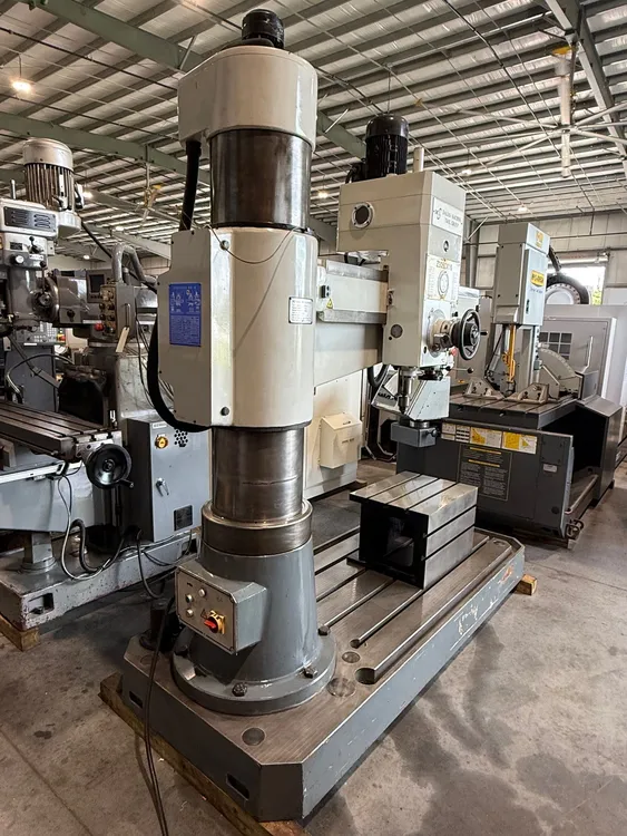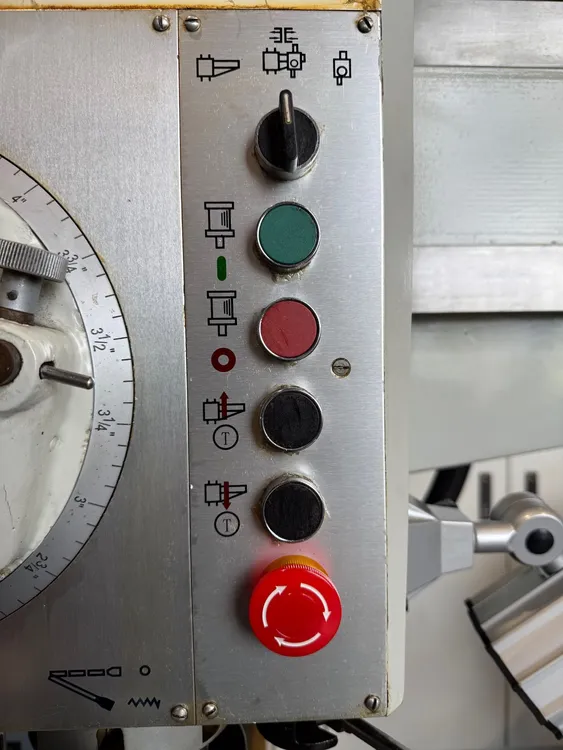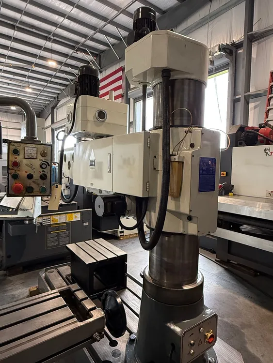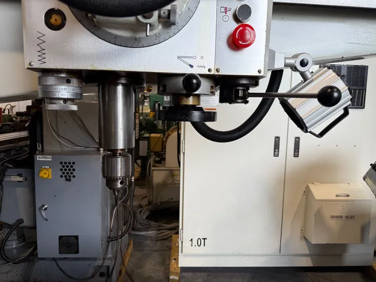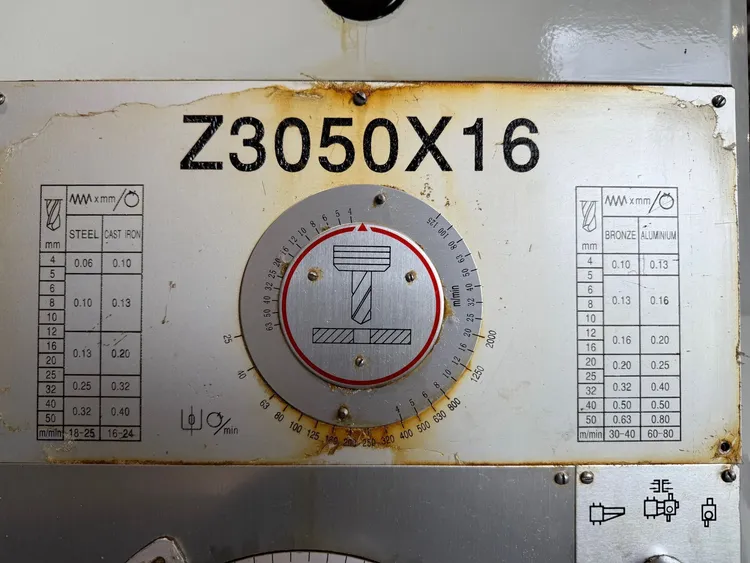 Reference #7695 Model # Z3050X16 Serial # 450836 Year of Manufacture- 10/2010’ Drill capacity- 2” Mild steel Spindle distance from column- 13.77” – 63” Spindle nose to base- 13” – 48” Spindle travel- 12.4” Spindle taper- # 5 Morse Spindle speeds- 25 – 2,000 R.P.M. Spindle speeds- 16 Base size- 94” x 39” Base working surface- 33” x 64-1/2” Box table size- 25-1/2” x 19-3/4” x 16” H Column diameter- 13.84” |