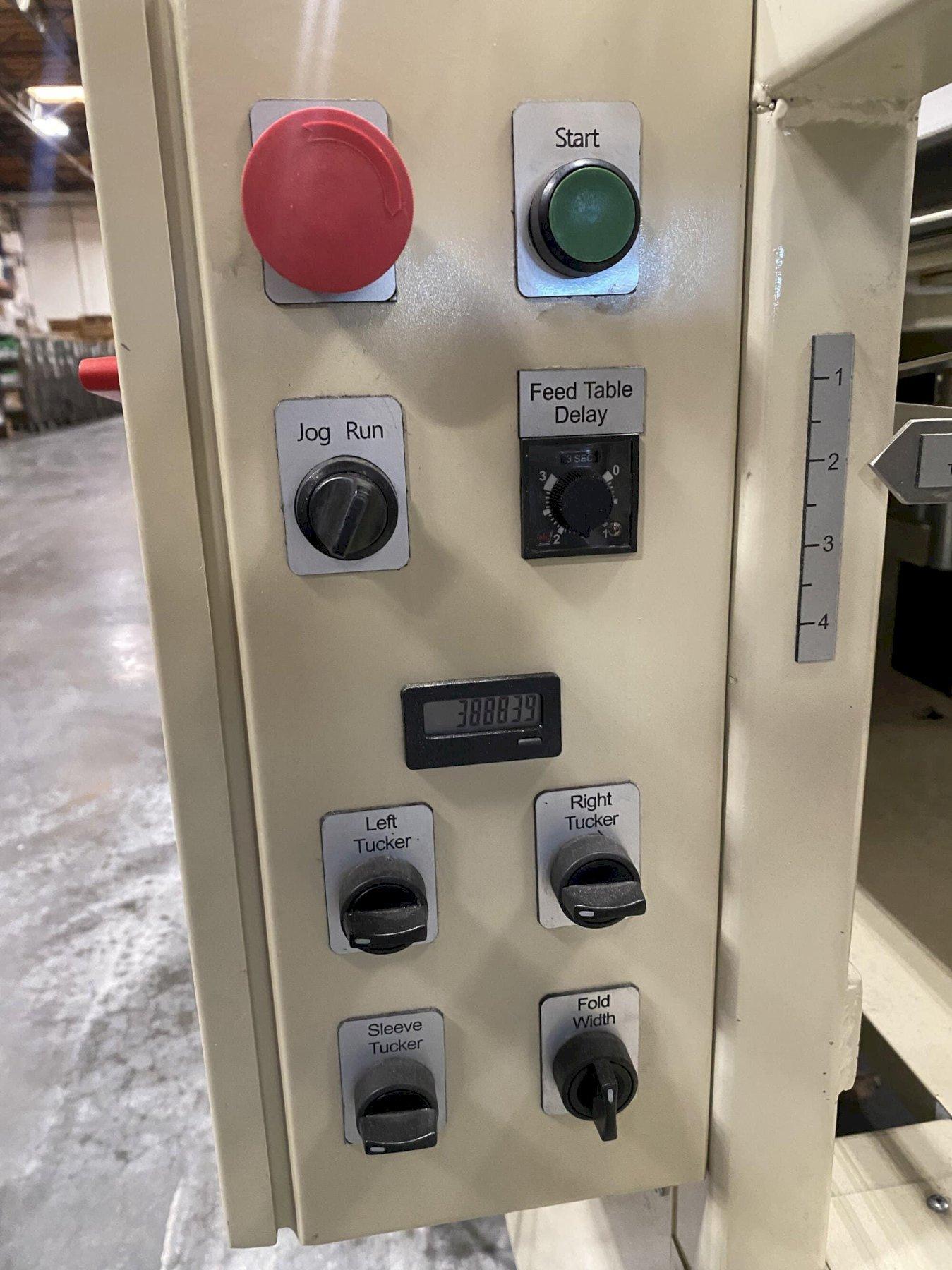 All specifications are assumed to be correct but must be confirmed by the purchasing entity.,Industrial-grade, pneumatic garment folding machine with integrated bagger and heat-sealer, built for high-throughput operations. Proven model for screen printers, fulfillment centers, and apparel production. Clean controls, programmable logic, and expandable modular setup. All specifications are assumed to be correct but must be confirmed by the purchasing entity.,Key Features and Specifications • Throughput: Up to 1,000 garments per hour • Power: 110 V, 50 Hz (optional 220 V upgrade available) • Air Requirements: 100 psi, 3–5 CFM, clean dry air • Dimensions: Unit: 11 ft (L) × 2 ft (W) × 50 in (H); Shipping: 12′ × 6′ × 3′ crate, ~1,600 lb • Weight: ~1,200 lb operational • Folding Adjustments: Manual controls for fold width, tucker positions, infeed table delay, stainless steel loading bed • Safety Features: Emergency stops (front/rear), Main disconnect switch, Guards over chains and pinch points • Controls: Jog/Run selector, Start button, Tally counter, Delay timers, Feed width, tucker toggles • Construction: Powder-coated steel frame, Stainless steel working surface • Included Modules: Inline bagger, Heat sealer, Sleeve tucker module • Modular Compatibility: Compatible with LS-4200-S long sleeve folder, conveyor stackers, auto counters All specifications are assumed to be correct but must be confirmed by the purchasing entity. |