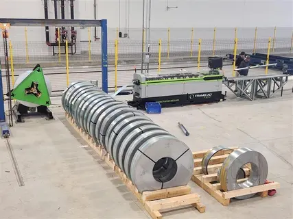 All specifications are assumed to be correct but must be confirmed by the purchasing entity.,Profile & Material Capacity Profile width (web): 2.5″ to 6″ Standard profile size: 3.5″ Material thickness: 0.024″ to 0.047″ All specifications are assumed to be correct but must be confirmed by the purchasing entity.,Performance Max line speed: 5,740 ft/hr Typical output: 2,460 ft/hr Main drive power: 10 HP Hydraulic power: 7.4 HP Hydraulic reservoir: 17 gal Voltage: 400 VAC, 3-phase, 25 A All specifications are assumed to be correct but must be confirmed by the purchasing entity.,Tooling & Features Roll-forming stations: 10 auto-gauging Punching tools (11 standard) Printer: Dual 16-point print heads Interface: 21.5″ touchscreen Software: FRAMECAD Detailer, ProDesign, Factory2 Hot-climate hydraulics: Optional for >104°F All specifications are assumed to be correct but must be confirmed by the purchasing entity. |