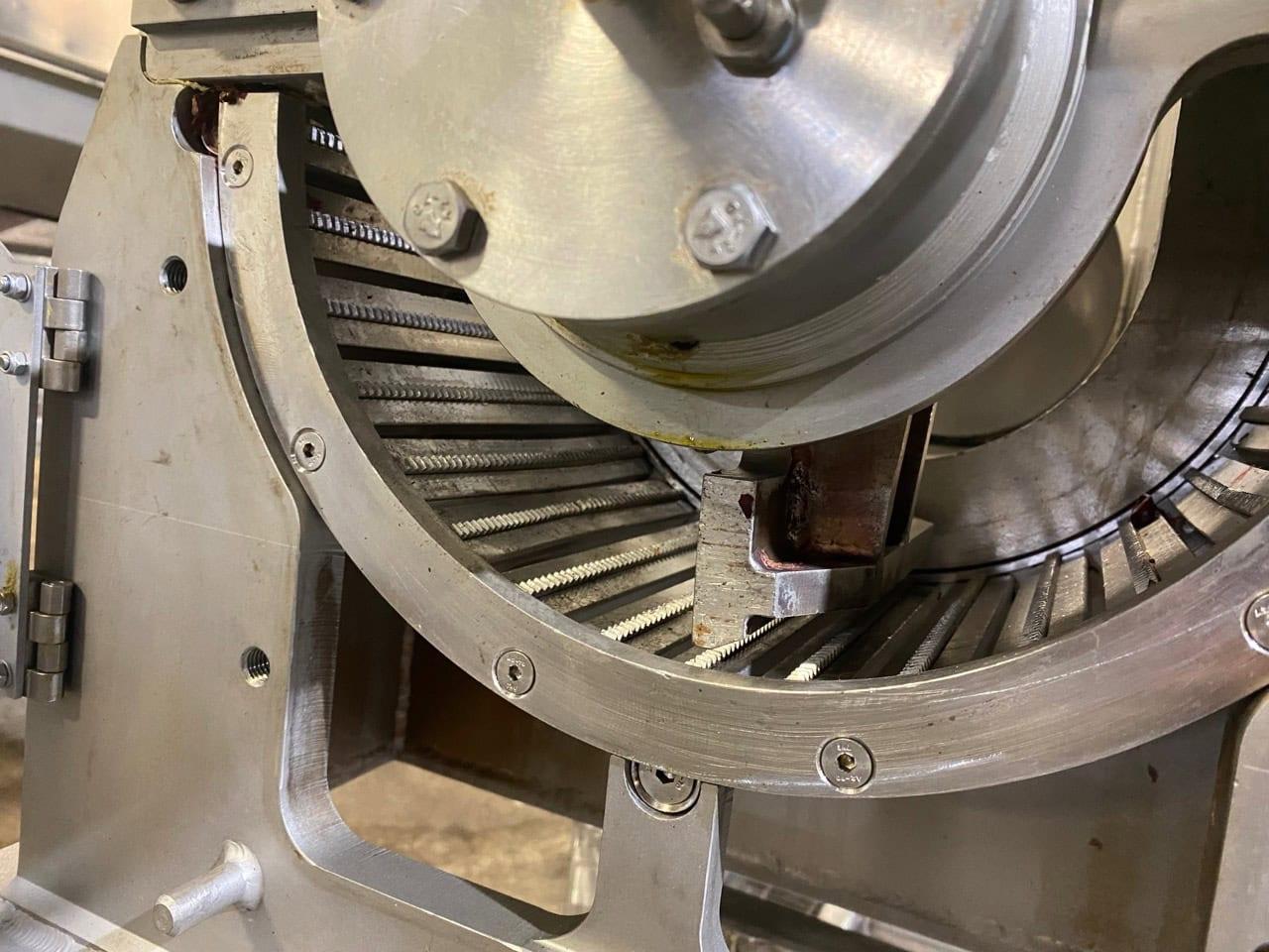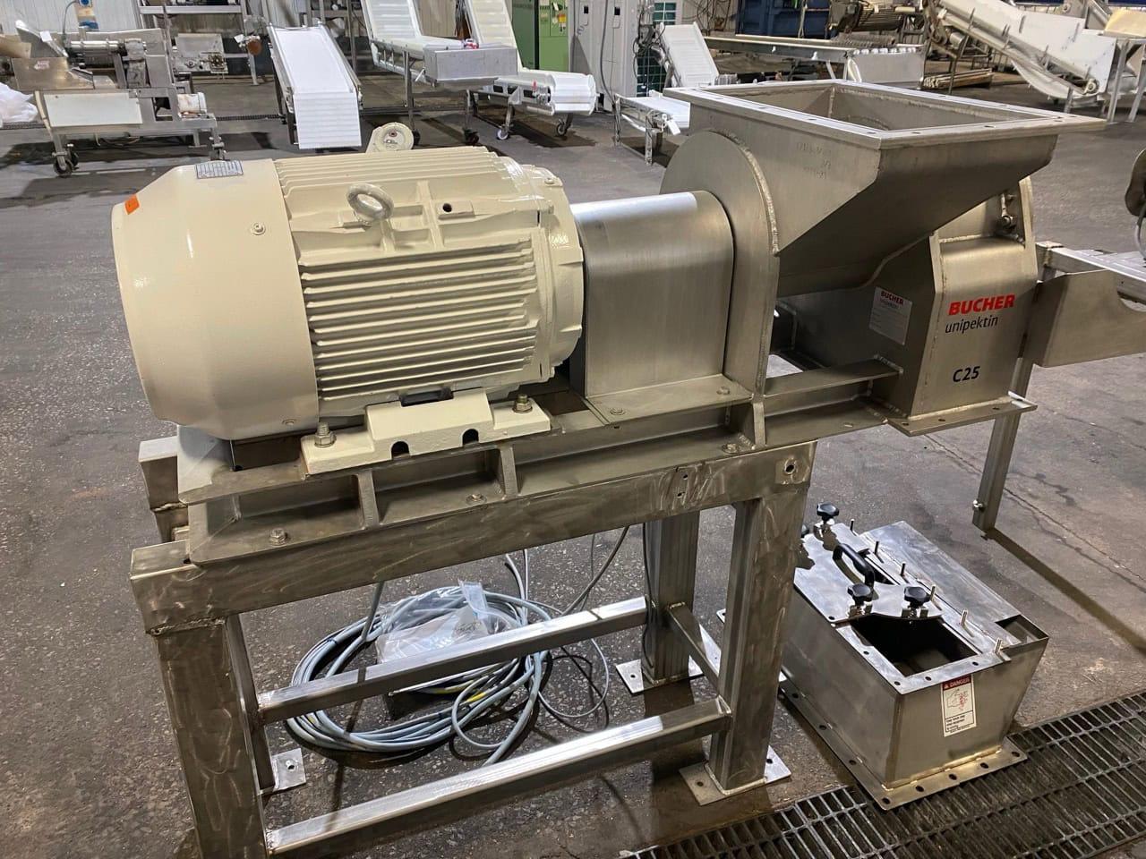 All specifications are assumed to be correct but must be confirmed by the purchasing entity.,The system includes a removable stainless discharge chute with threaded tie-down lugs, polished auger feed inlet, and visible cutter blade housing with radial slot plates. Condition is excellent — no visible rust, gouging, or deformation. Feed zone, blade chamber, and discharge port are all intact, and the unit is fully staged for crate or integration. All specifications are assumed to be correct but must be confirmed by the purchasing entity.,Specifications & Features Bucher Unipektin C25 rotary cutter All specifications are assumed to be correct but must be confirmed by the purchasing entity.,Product suitability: apples, pears, beets, carrots, tomato, stone fruit mash, citrus peel, etc. All specifications are assumed to be correct but must be confirmed by the purchasing entity.,Capacity range: 10 – 25 metric tons/hr (depending on feed type and screen) All specifications are assumed to be correct but must be confirmed by the purchasing entity.,Rotor diameter: 250 mm All specifications are assumed to be correct but must be confirmed by the purchasing entity.,Screen size: standard slotted disc, removable with wedge lock blade retainer All specifications are assumed to be correct but must be confirmed by the purchasing entity.,Cutting principle: rotating blade rotor against fixed serrated stator segment All specifications are assumed to be correct but must be confirmed by the purchasing entity.,Auger-fed vertical inlet screw – stainless, dual-pitch spiral, full coverage All specifications are assumed to be correct but must be confirmed by the purchasing entity.,Product chamber: full weldment with TIG seams and flanged access All specifications are assumed to be correct but must be confirmed by the purchasing entity.,Chamber opens via hinged front cover for cutter access All specifications are assumed to be correct but must be confirmed by the purchasing entity.,Discharge: removable chute with machined saddle and lift rings All specifications are assumed to be correct but must be confirmed by the purchasing entity.,Frame: heavy-duty stainless support legs with leveling pads All specifications are assumed to be correct but must be confirmed by the purchasing entity.,Motor: IEC flange-mounted 3-phase motor, 15–25 HP (est.), with right-angle gear reducer All specifications are assumed to be correct but must be confirmed by the purchasing entity.,Integrated cable bundle and control harness included All specifications are assumed to be correct but must be confirmed by the purchasing entity.,Designed for CIP/washdown with smooth welds, radius corners, and no pits All specifications are assumed to be correct but must be confirmed by the purchasing entity.,Removable bolt-on discharge collection port with guide tabs All specifications are assumed to be correct but must be confirmed by the purchasing entity. |