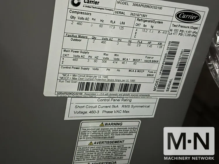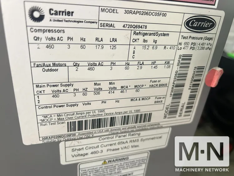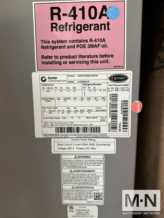 Similar Listings to - 20 TON AIR COOLED CHILLER MODEL 30RAP0206DC05F00 MFG IN 2021 AND NEVER USED (2) AVAILABLE