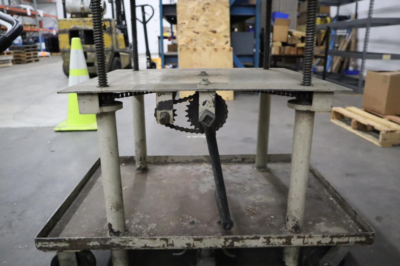 Lot 107: Economy Die Lift Cart, 36" x 24" Platform, Hand Crank Elevation Manufacturer: Economy Model: Die Cart Main Unit Approx Weight: 0.00 lbs Main Unit Dimensions (in inches): Length: 0.00" Width: 0.00" Height: 0.00" Seller Company: Regal Machine - South Seller Contact: Machinesused.com Auction Phone: (763) 745-1166 Item Location: Regal Machine - South, 26615 Fallbrook Avenue, Wyoming, MN 55092 Location Contact: Machinesused.com Auction Phone: (763) 745-1166 Inspection Date & Time: Friday, October 10, 2025 9AM to 4PM Dock Door: 12' x 12' Ground Level Door Loading Dock: Ground Level Removal Dates and Times: This item must be removed between Monday, October 20, 2025 and Wednesday, October 22, 2025