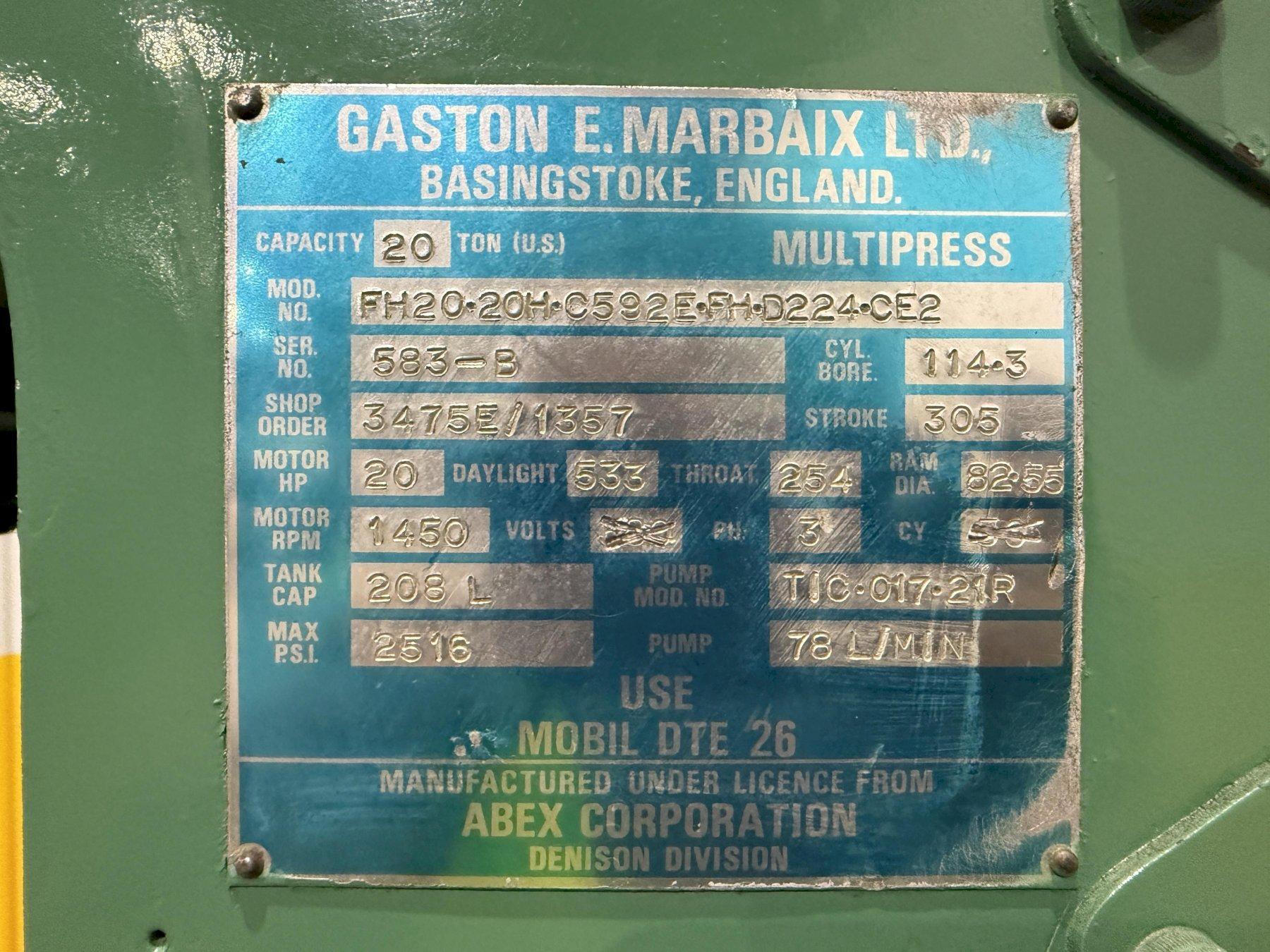 MODEL .................................. FH20-20H-C592E-FH-D244-CE2 FLOOR STANDING BED AREA ................ 26" L-R x 17" F-B CENTER HOLE ............................ 9" L-R x 9" F-B BOLSTER ................................ 40" L-R x 18" F-B x 2.5" THICK STROKE ................................. 0 - 12" MAX DAYLIGHT OPENING (TOTAL)................ 21" MAX DAYLIGHT OPENING (OVEFR BOLSTER) ....... 18.5" maximum THROAT DEPTH ........................... 10" RAM DIAMETERR .......................... 4.5"/3.25" @ 2516 PSI - 20 TONS FLOOR TO TOP OF BED .................... 32" HYDRAULIC PUMP POWER UNIT: MOTOR .................................. 20 HP SPEEDS (APPROX): MINUTE CLOSING(TO 20 TONS) ............. 550" MINUTE PRESSING(TO 20 TONS)............. 250" MINUTE RETURN .......................... 600" PUSHBUTTON OPERATION CONTROLS: STROKE & PRESSURE ...................... YES DUAL TOUCH PALMS ....................... YES PRESSURE GAUGE ......................... YES |