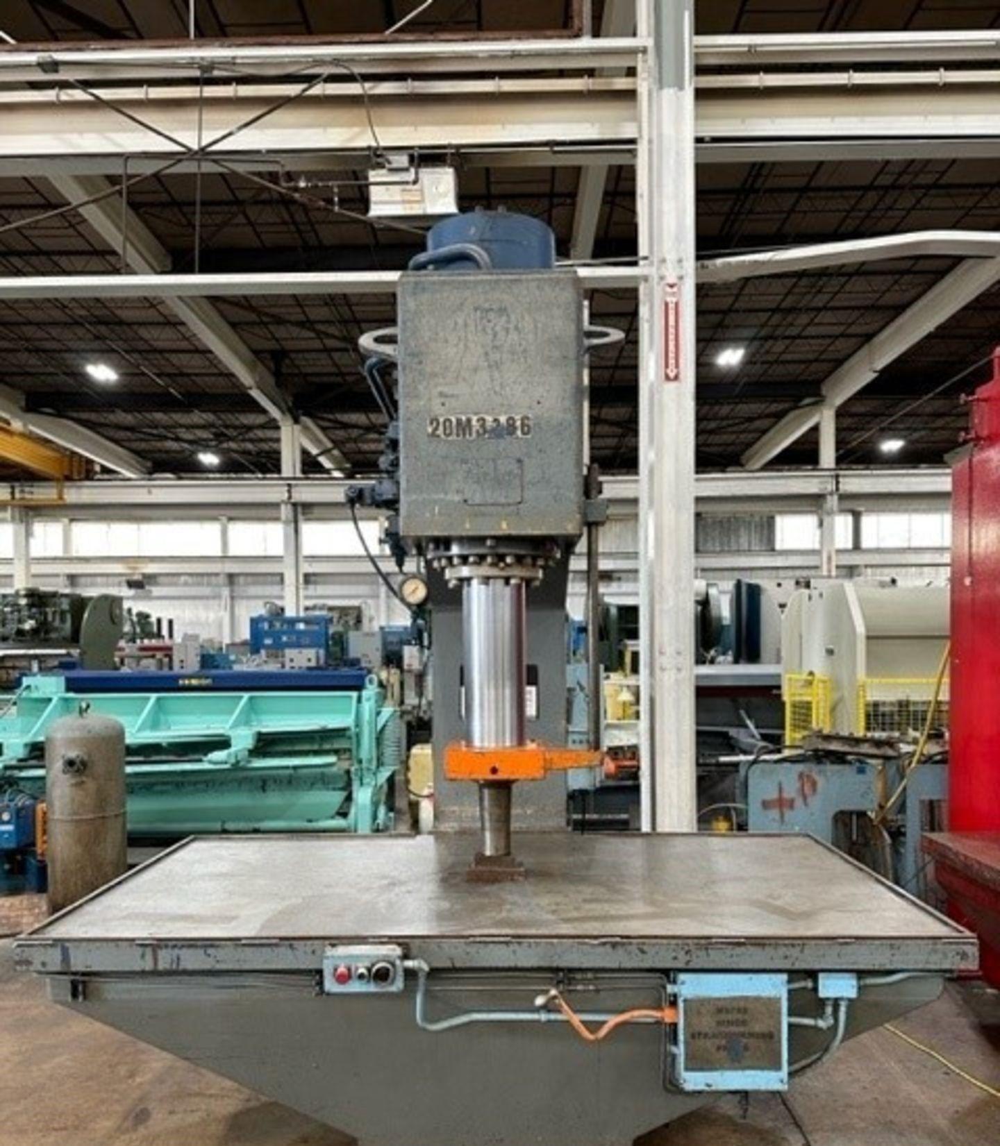 Floor standing Bed area: 108" L-R x 58" F-B Ram mounting block: 14" L-R x 14" F-B Stroke: 0 - 24" maximum Daylight opening (total): 36" maximum Throat depth: 32" Ram diameter: 14"/9" @ 1950 PSI - 150 tons Floor to top of bed: 36" Power unit: Vickers hydraulic pump driven by 10 HP 1160 460/3/60 motor Controls: Pushbutton operation w/stroke & pressure control Operator hand lever & palm button Pressure gauge |