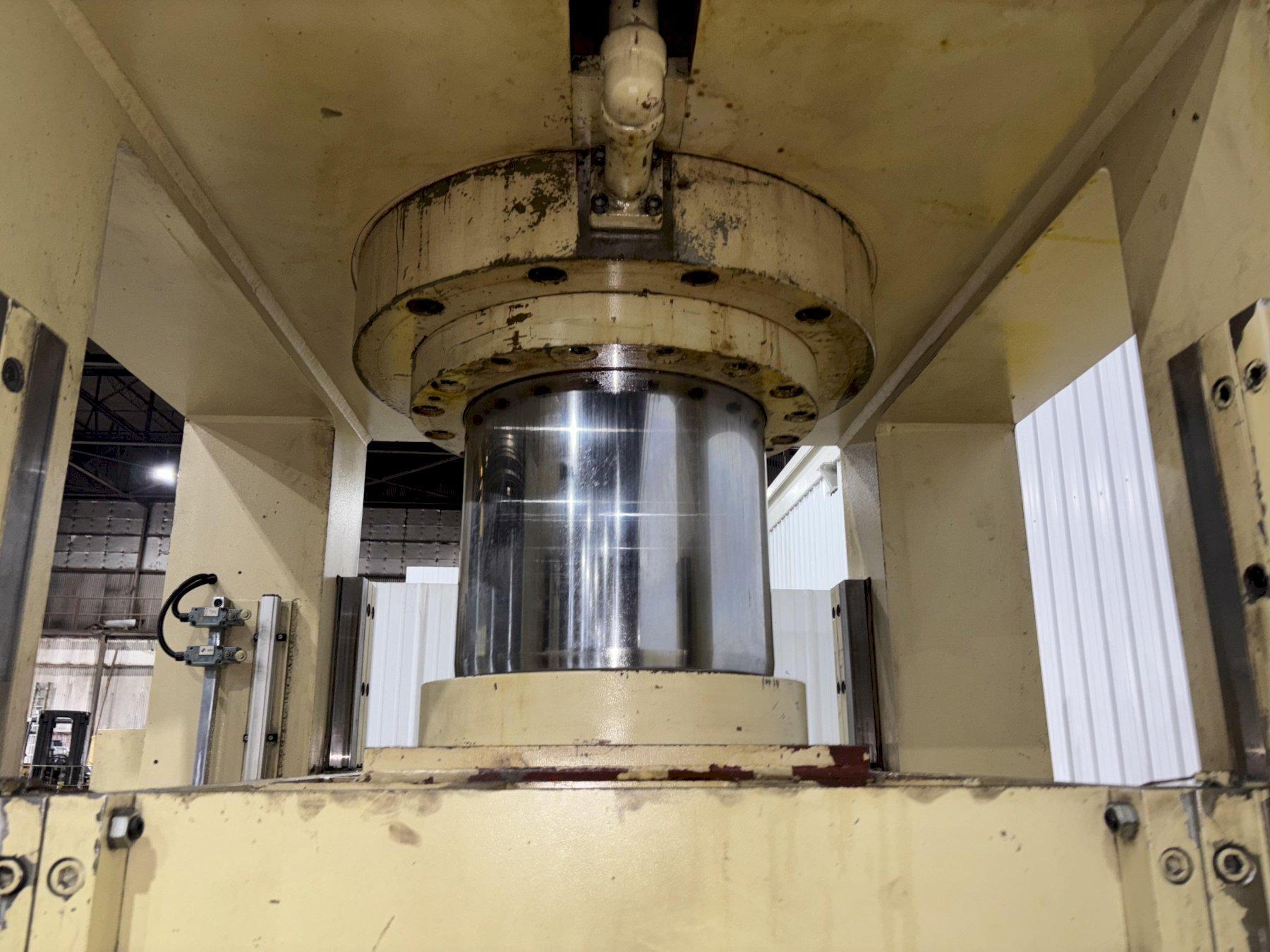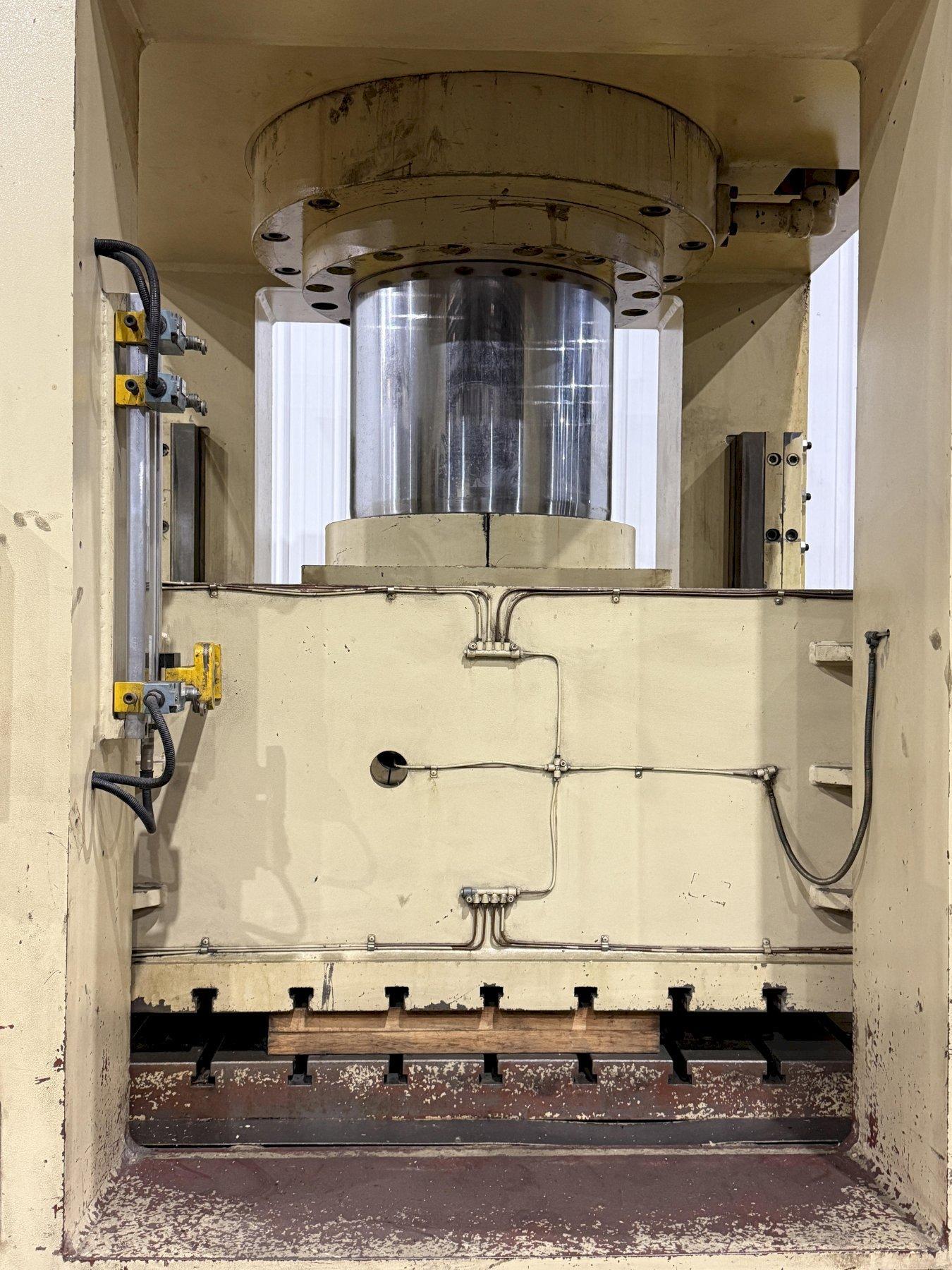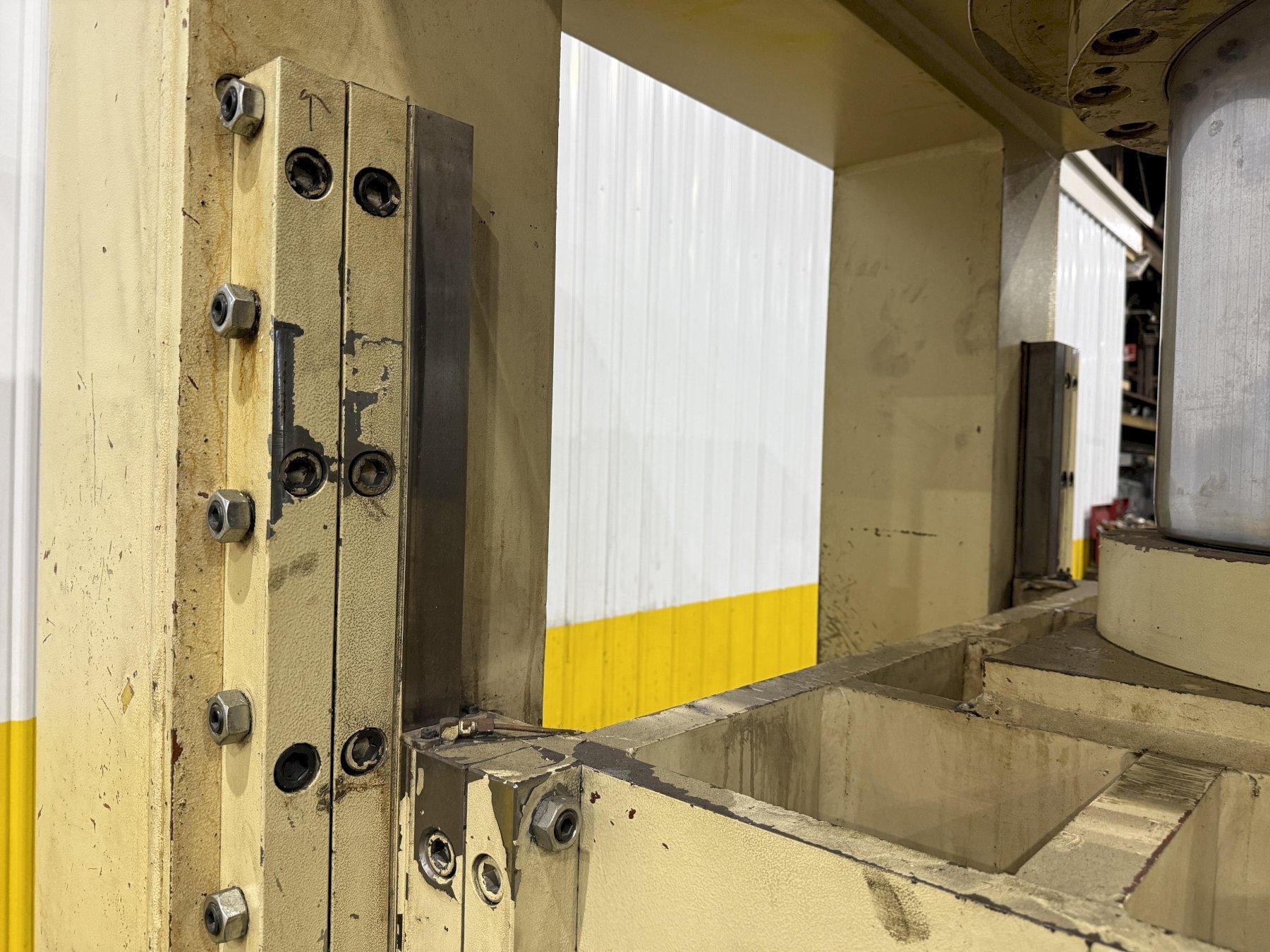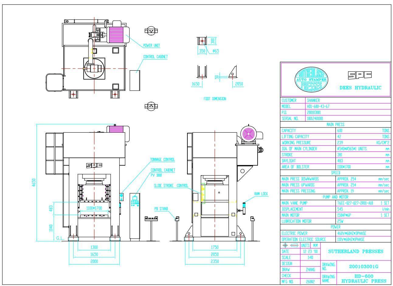 MODEL .............................. HD1-600-43-67 YEAR ............................... 2000 TYPE ............................... DOWNSTROKE HOUSING FLOORSTANDING ...................... YES CAPACITY ........................... 600 TONS LIFTING CAPACITY ................... 42 TONS STROKE ............................. 0 to 15" DAYLIGHT OPENING ................... 19" 8 PONT GIB GUIDED SLIDE ............ YES AREA OF BED (NOMINAL) .............. 43" L-R x 67" F-B AREA OF SLIDE (NOMINAL) ............ 43" L-R x 67" F-B MAIN RAM DIAMETER .................. 22.3"/21.3" @ 3430 PSI - 660 TONS FLOOR TO TOP OF BED ................ 41" DENISON HYDRAULIC PUMP(TOP OF PRESS): MOTOR .............................. 150HP / 1180RPM 230/460V / 3PH /60CY SPEEDS (APPROX); CLOSING ............................ 600"/MINUTE PRESSING ........................... 45"/MINUTE TO 660 TONS RETURN ............................. 600" MINUTE CONTROLS: PUSHBUTTON WITH STROKE & PRESSURE CONTROL DUAL PALM BUTTONS ALL PRESS FUNCTIONS CONTROLLED VIA PLC |