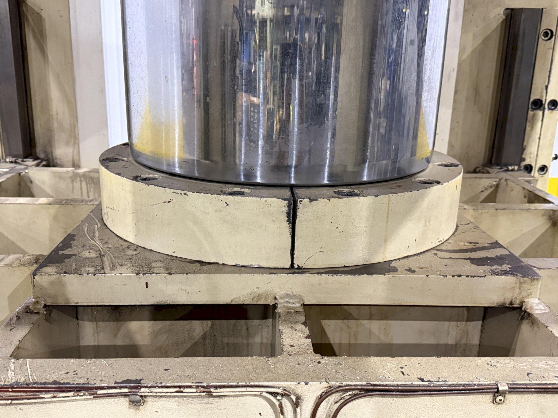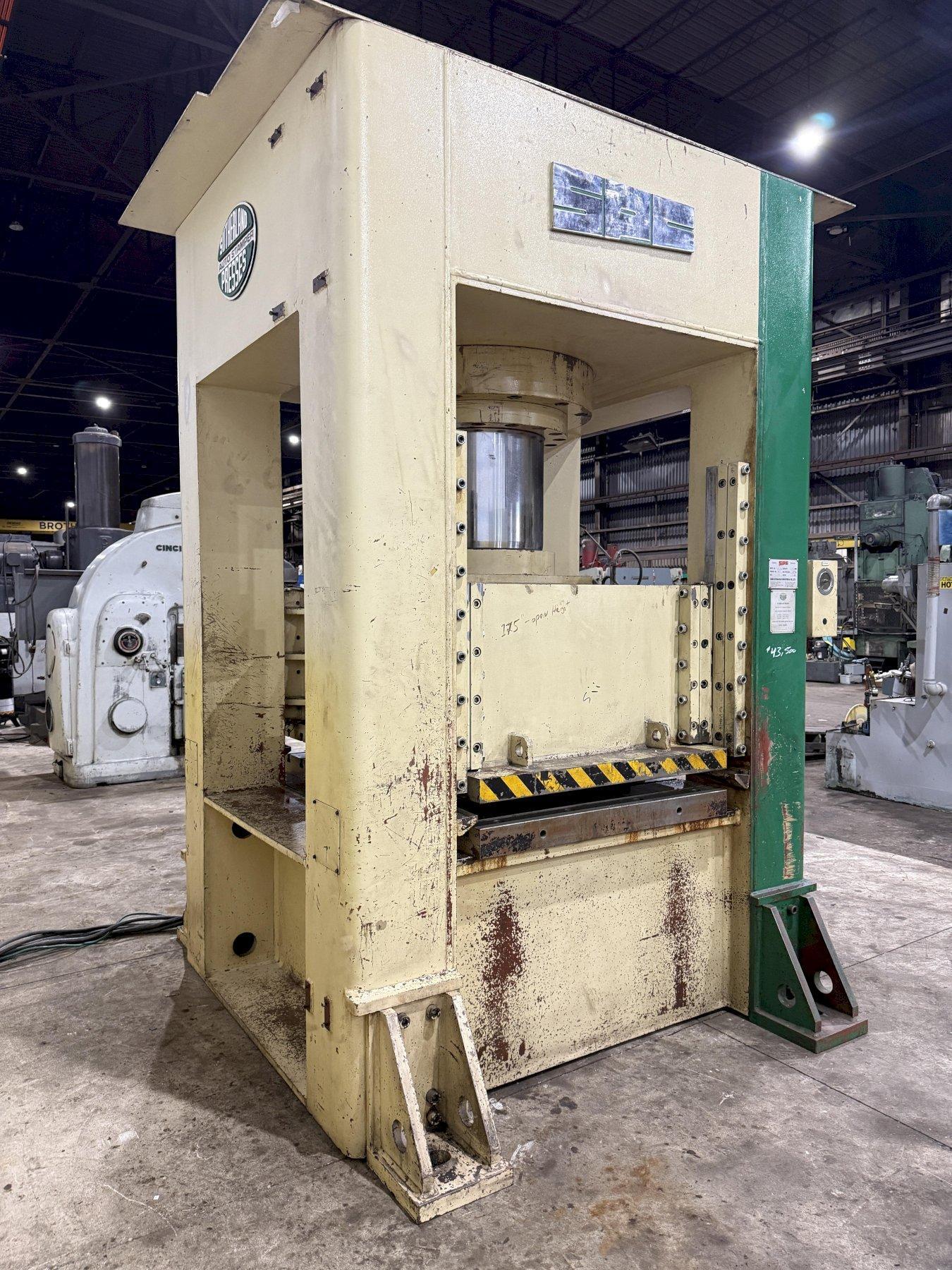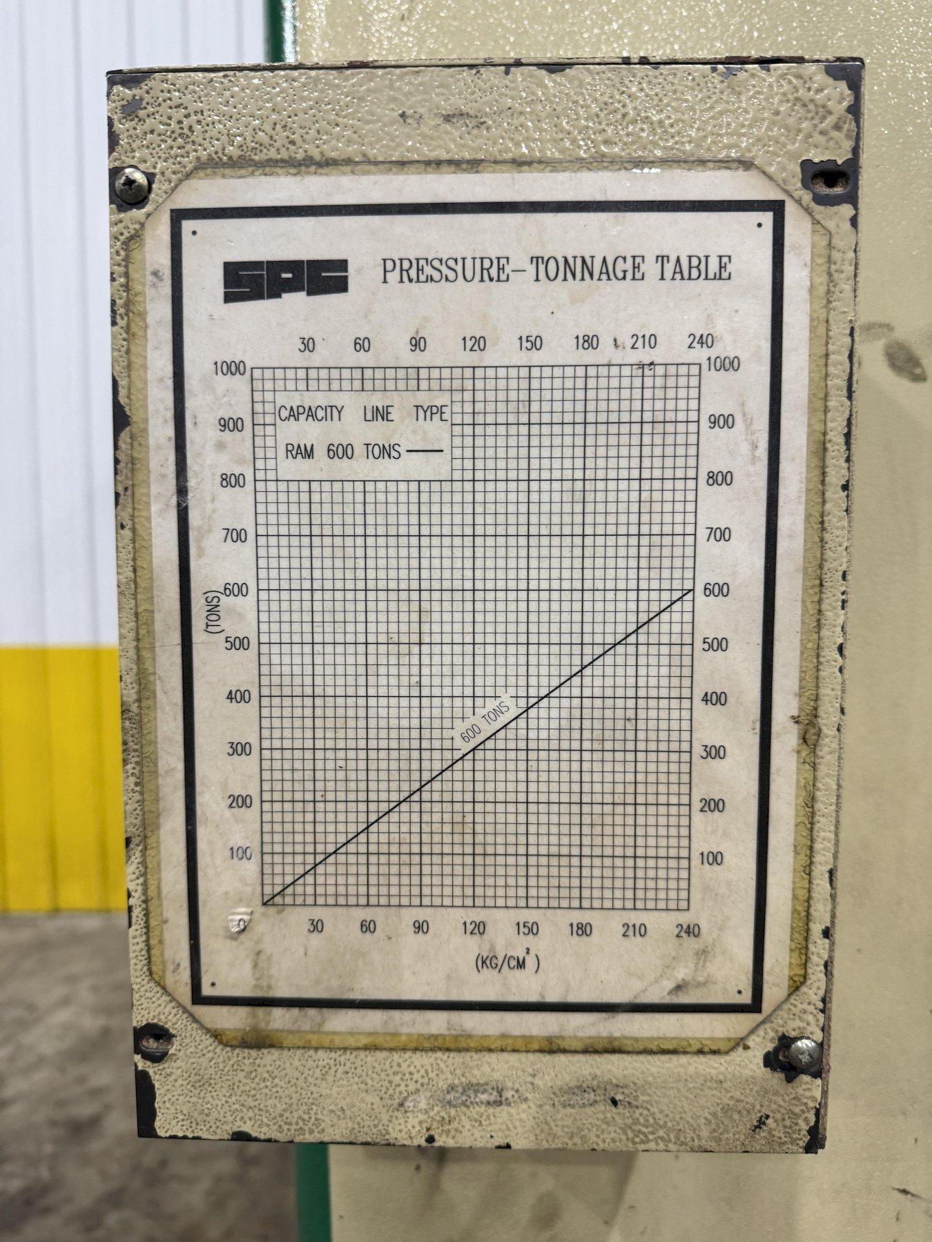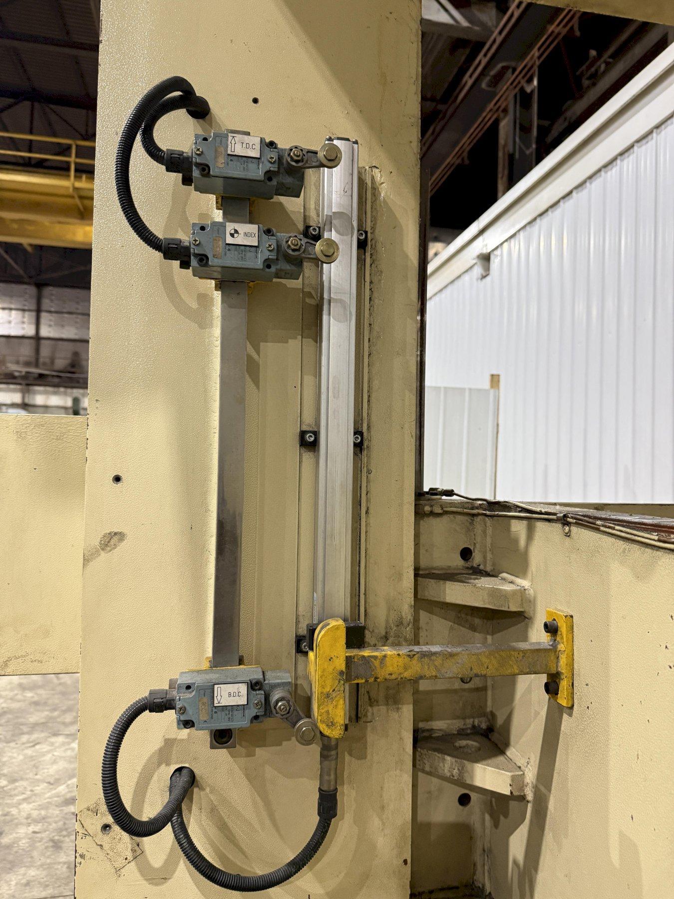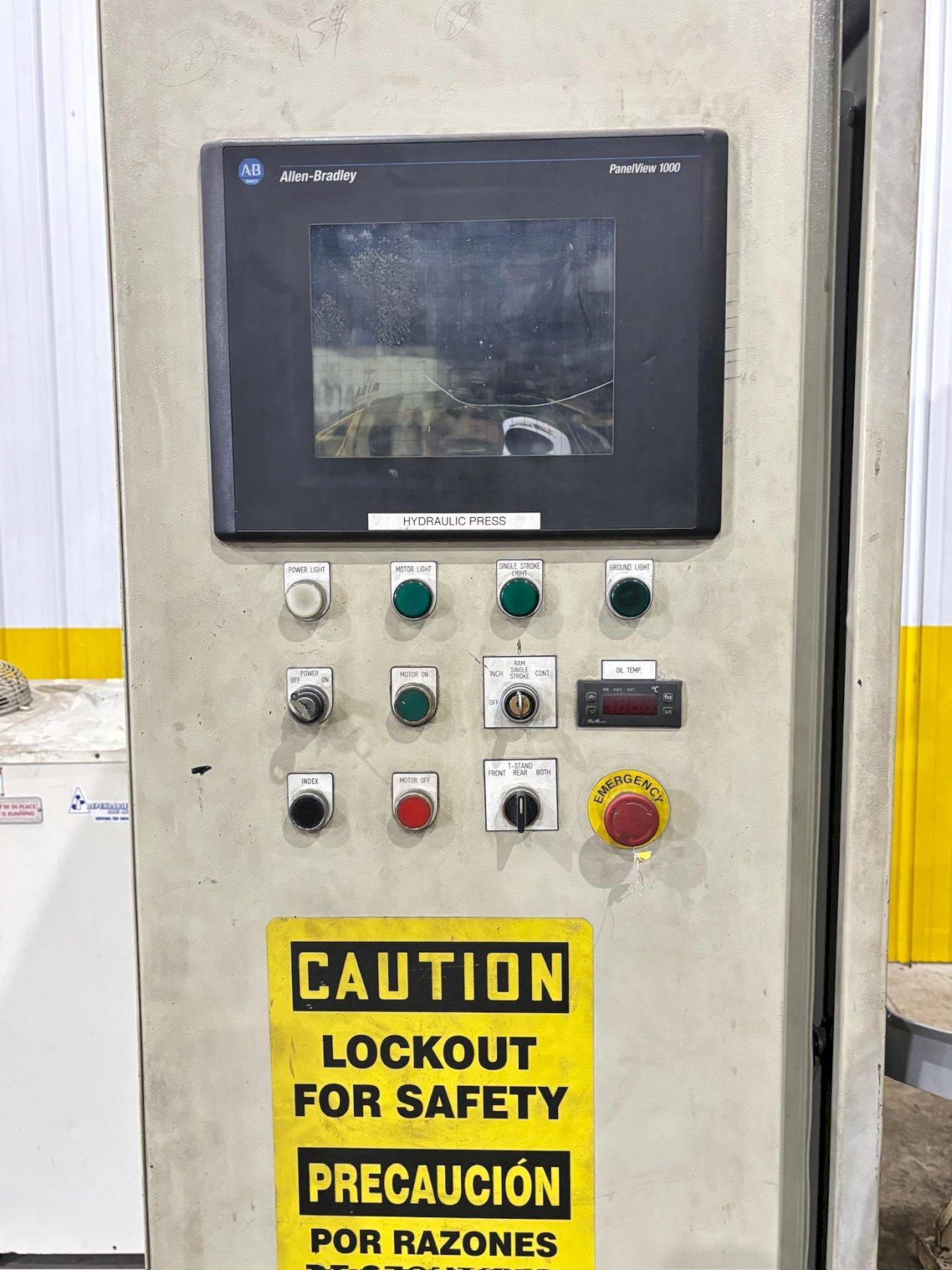 MODEL .............................. HD1-600-43-67 YEAR ............................... 2000 TYPE ............................... DOWNSTROKE HOUSING FLOORSTANDING ...................... YES CAPACITY ........................... 600 TONS LIFTING CAPACITY ................... 42 TONS STROKE ............................. 0 to 15" DAYLIGHT OPENING ................... 19" 8 PONT GIB GUIDED SLIDE ............ YES AREA OF BED (NOMINAL) .............. 43" L-R x 67" F-B AREA OF SLIDE (NOMINAL) ............ 43" L-R x 67" F-B MAIN RAM DIAMETER .................. 22.3"/21.3" @ 3430 PSI - 660 TONS FLOOR TO TOP OF BED ................ 41" DENISON HYDRAULIC PUMP(TOP OF PRESS): MOTOR .............................. 150HP / 1180RPM 230/460V / 3PH /60CY SPEEDS (APPROX); CLOSING ............................ 600"/MINUTE PRESSING ........................... 45"/MINUTE TO 660 TONS RETURN ............................. 600" MINUTE CONTROLS: PUSHBUTTON WITH STROKE & PRESSURE CONTROL DUAL PALM BUTTONS ALL PRESS FUNCTIONS CONTROLLED VIA PLC |
