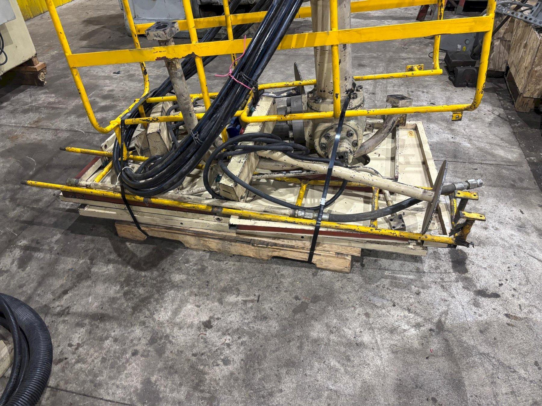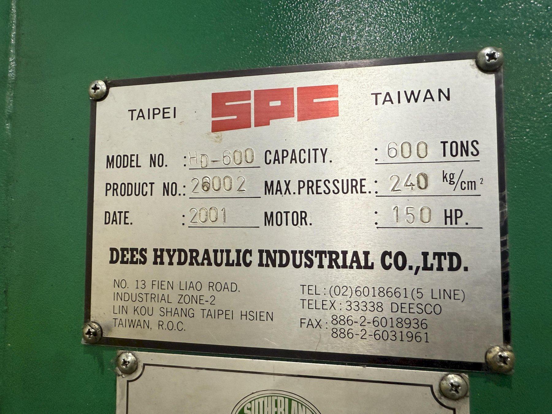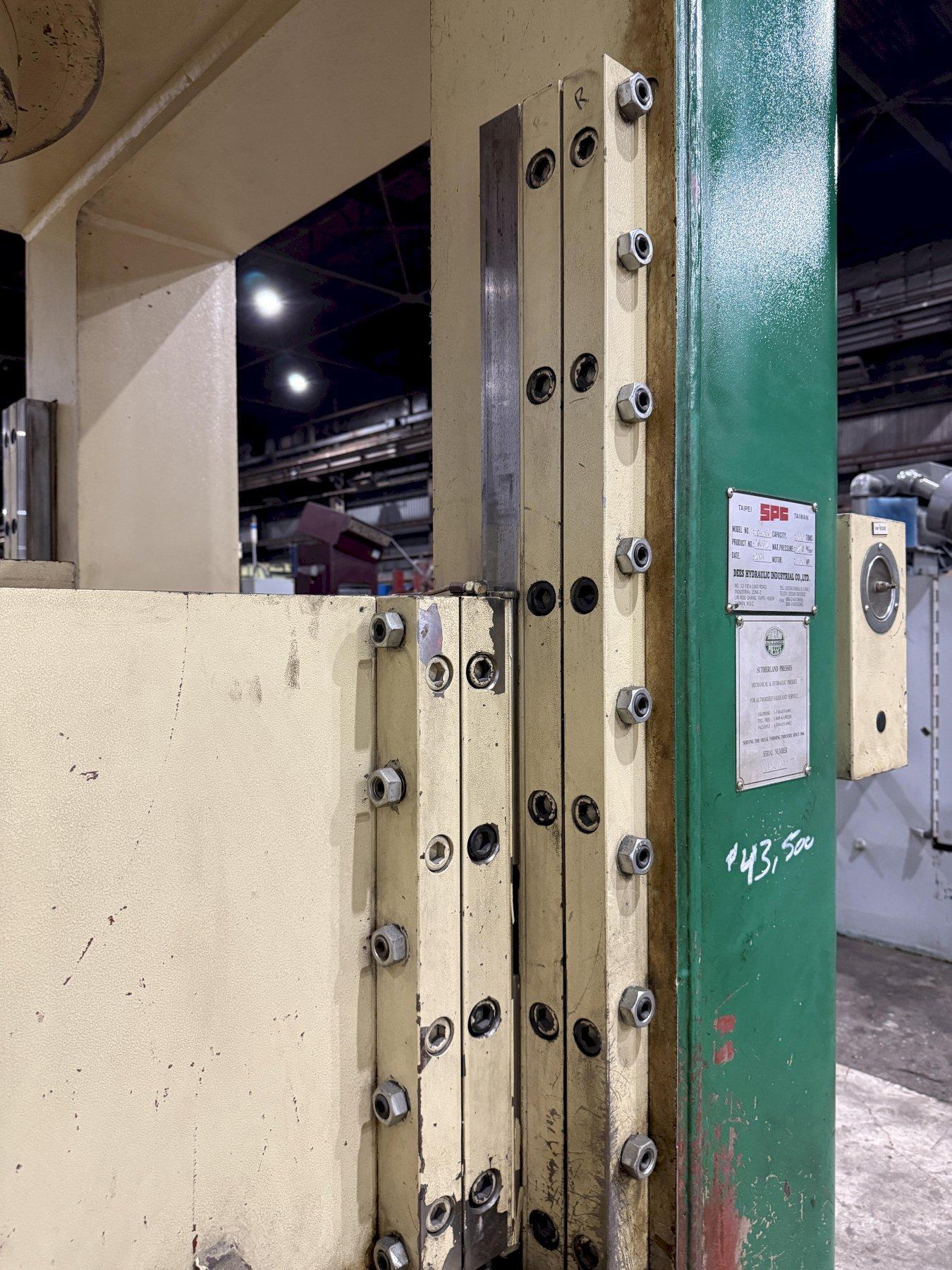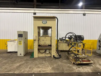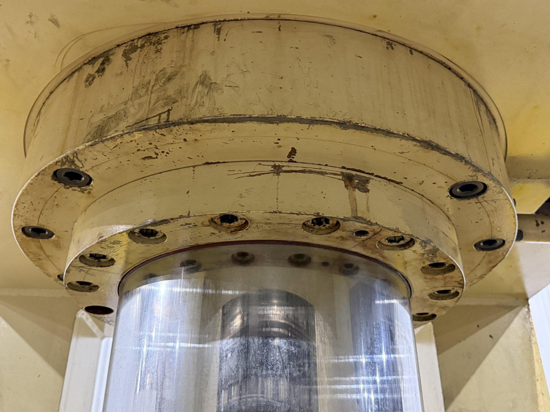 MODEL .............................. HD1-600-43-67 YEAR ............................... 2000 TYPE ............................... DOWNSTROKE HOUSING FLOORSTANDING ...................... YES CAPACITY ........................... 600 TONS LIFTING CAPACITY ................... 42 TONS STROKE ............................. 0 to 15" DAYLIGHT OPENING ................... 19" 8 PONT GIB GUIDED SLIDE ............ YES AREA OF BED (NOMINAL) .............. 43" L-R x 67" F-B AREA OF SLIDE (NOMINAL) ............ 43" L-R x 67" F-B MAIN RAM DIAMETER .................. 22.3"/21.3" @ 3430 PSI - 660 TONS FLOOR TO TOP OF BED ................ 41" DENISON HYDRAULIC PUMP(TOP OF PRESS): MOTOR .............................. 150HP / 1180RPM 230/460V / 3PH /60CY SPEEDS (APPROX); CLOSING ............................ 600"/MINUTE PRESSING ........................... 45"/MINUTE TO 660 TONS RETURN ............................. 600" MINUTE CONTROLS: PUSHBUTTON WITH STROKE & PRESSURE CONTROL DUAL PALM BUTTONS ALL PRESS FUNCTIONS CONTROLLED VIA PLC |