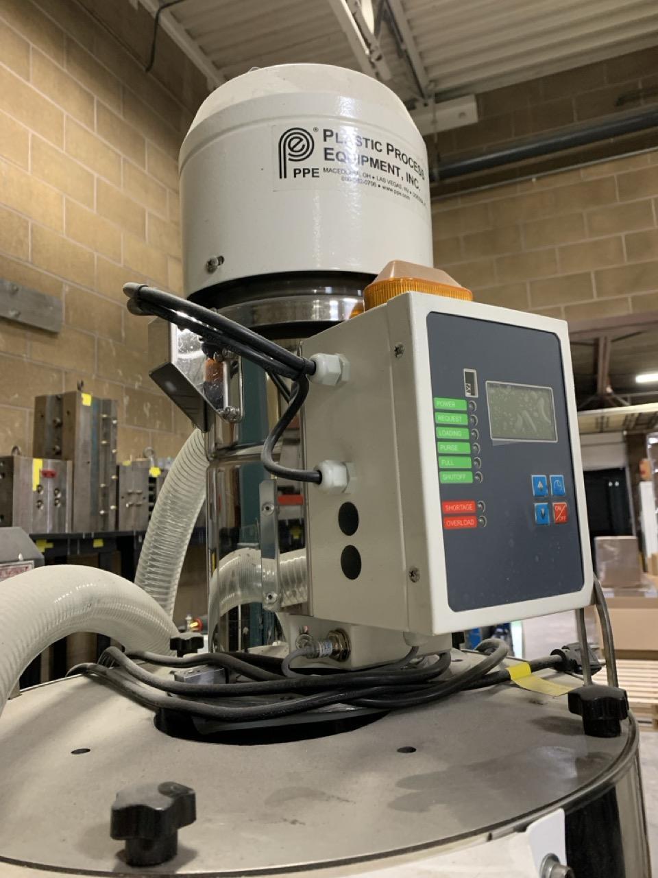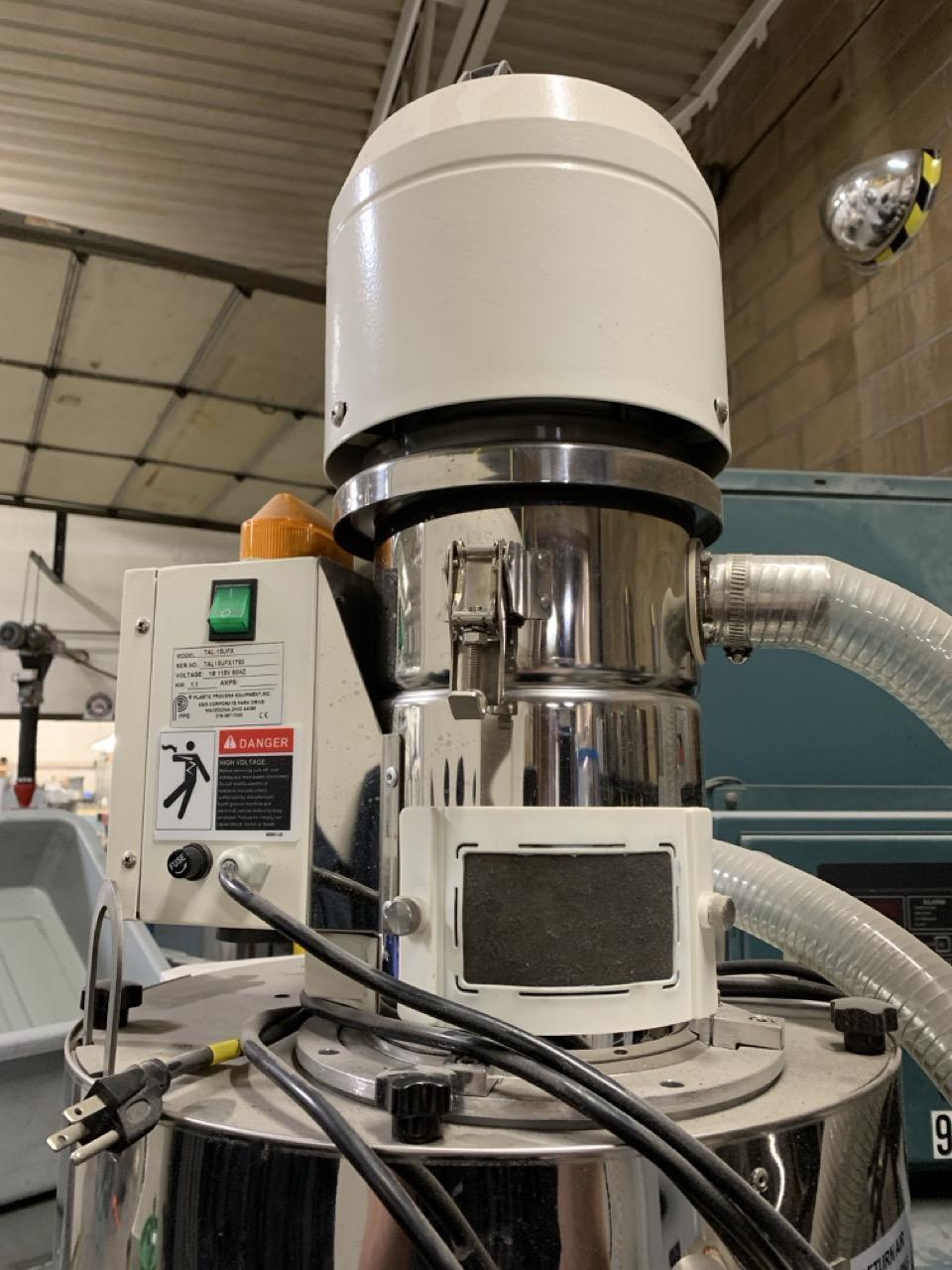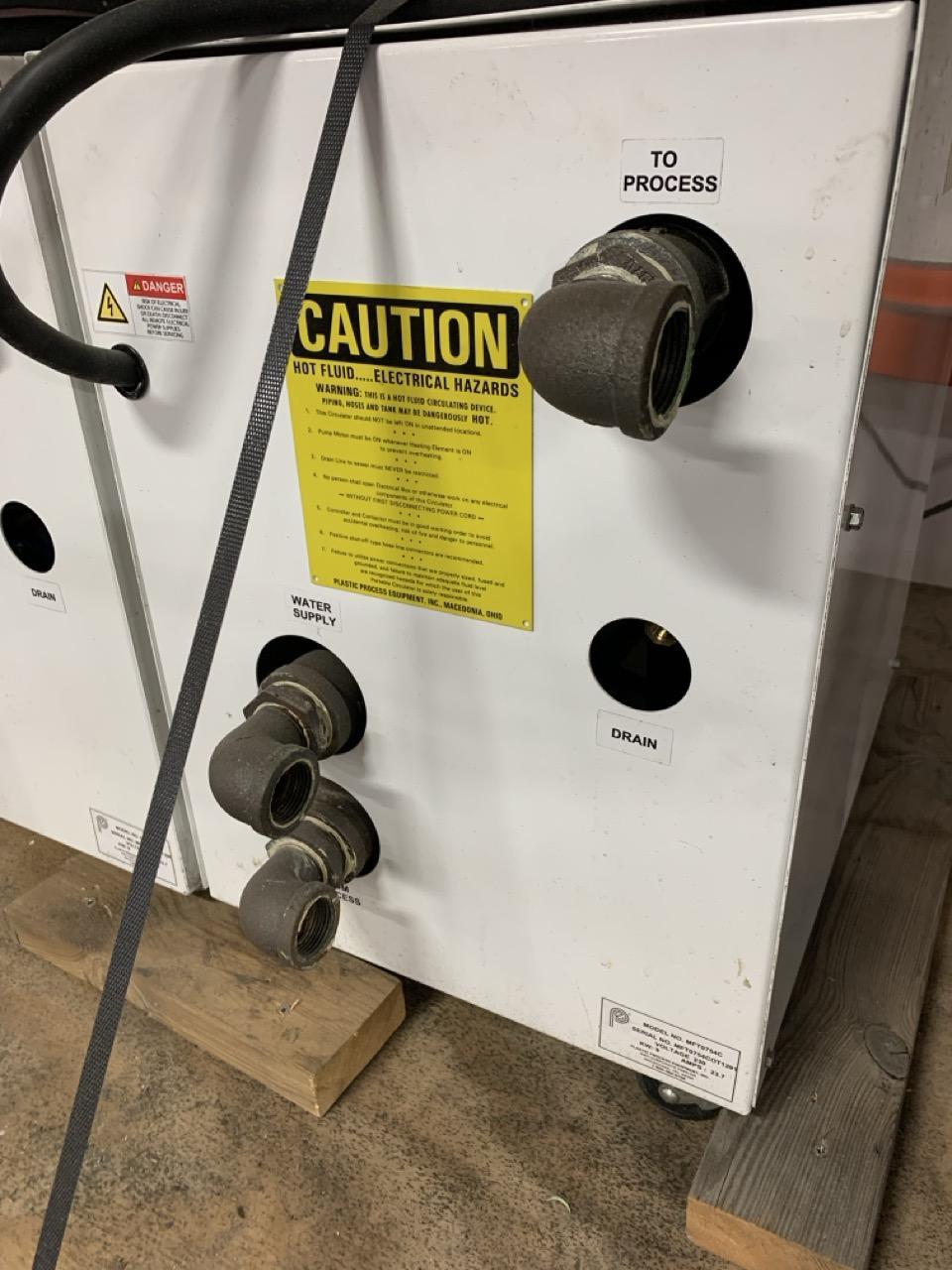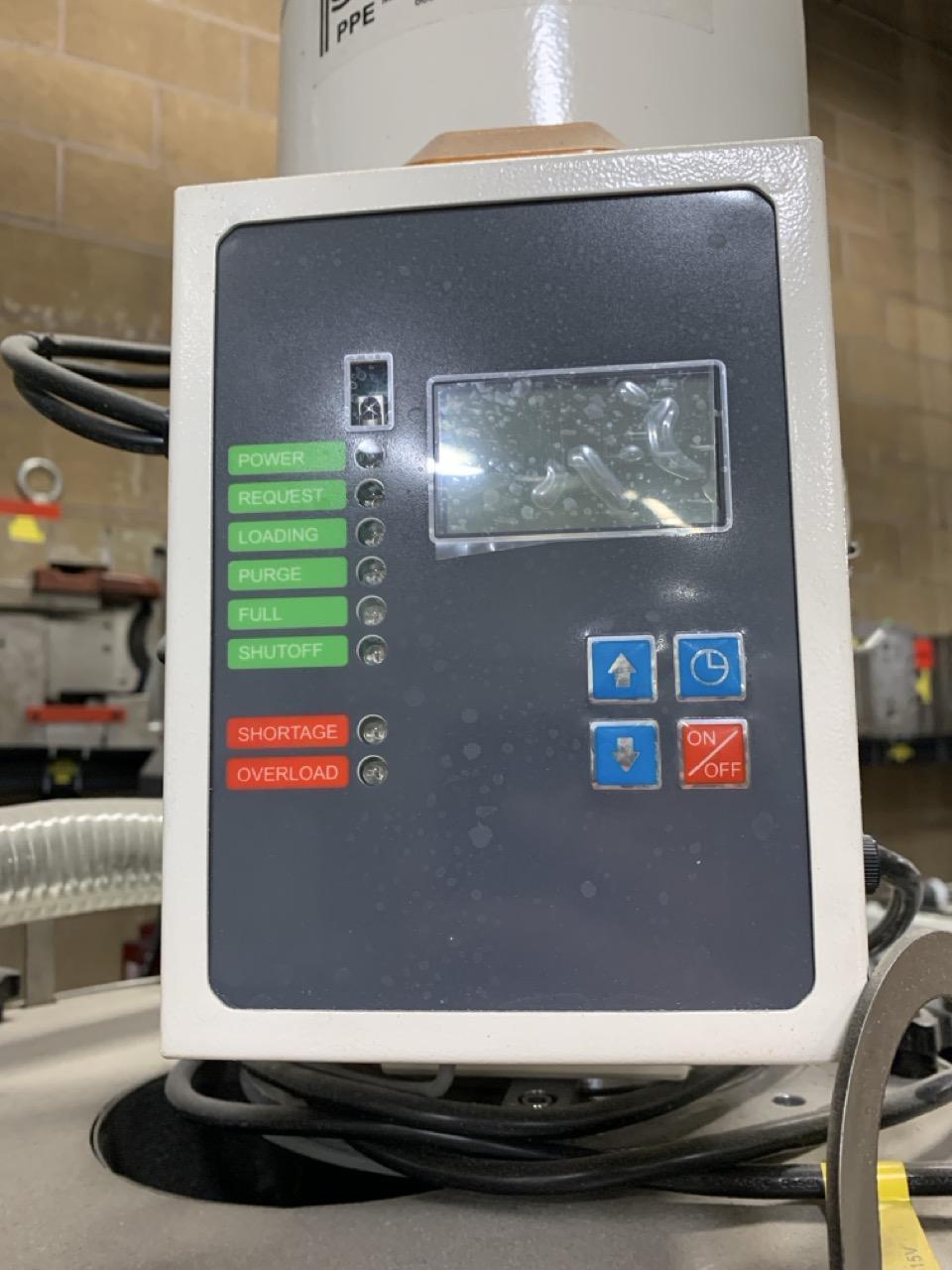 All specifications are assumed to be correct but must be confirmed by the purchasing entity.,Key Features and Specifications All specifications are assumed to be correct but must be confirmed by the purchasing entity.,FX-100460 – Oil-Based Temperature Controller • Voltage: 460V / 60 Hz • Power Rating: 1.1 kW • Interface: Touchscreen HMI, emergency stop • Mounting: Caster base, enclosed design • Use: Mold temperature stabilization (presumed oil-based) All specifications are assumed to be correct but must be confirmed by the purchasing entity.,MFT0754C (x2) – Water-Based Temperature Control Units • Voltage: 230V (check plug mismatch labeled as 480V) • Power: 9 kW, 23.7 Amps • Max Temp: 250°F • Interface: PID controller with indicators • Ports: Water In, Return, Process, Drain • Construction: Steel frame, mobile casters All specifications are assumed to be correct but must be confirmed by the purchasing entity.,DH-120USD – Hopper Dryer • Type: Stainless steel resin dryer • Capacity: ~120 lb estimated • Mounting: On steel stand • Window: Resin level viewing glass • Control: Not visible – may be shared with loader All specifications are assumed to be correct but must be confirmed by the purchasing entity.,TAL-15UFX – Vacuum Loader • Voltage: 115V, Single Phase • Power: 1.1 kW • Control: ON/OFF, purge/fill/shortage/overload indicators • Mounting: Hopper-top vacuum motor integration All specifications are assumed to be correct but must be confirmed by the purchasing entity. |