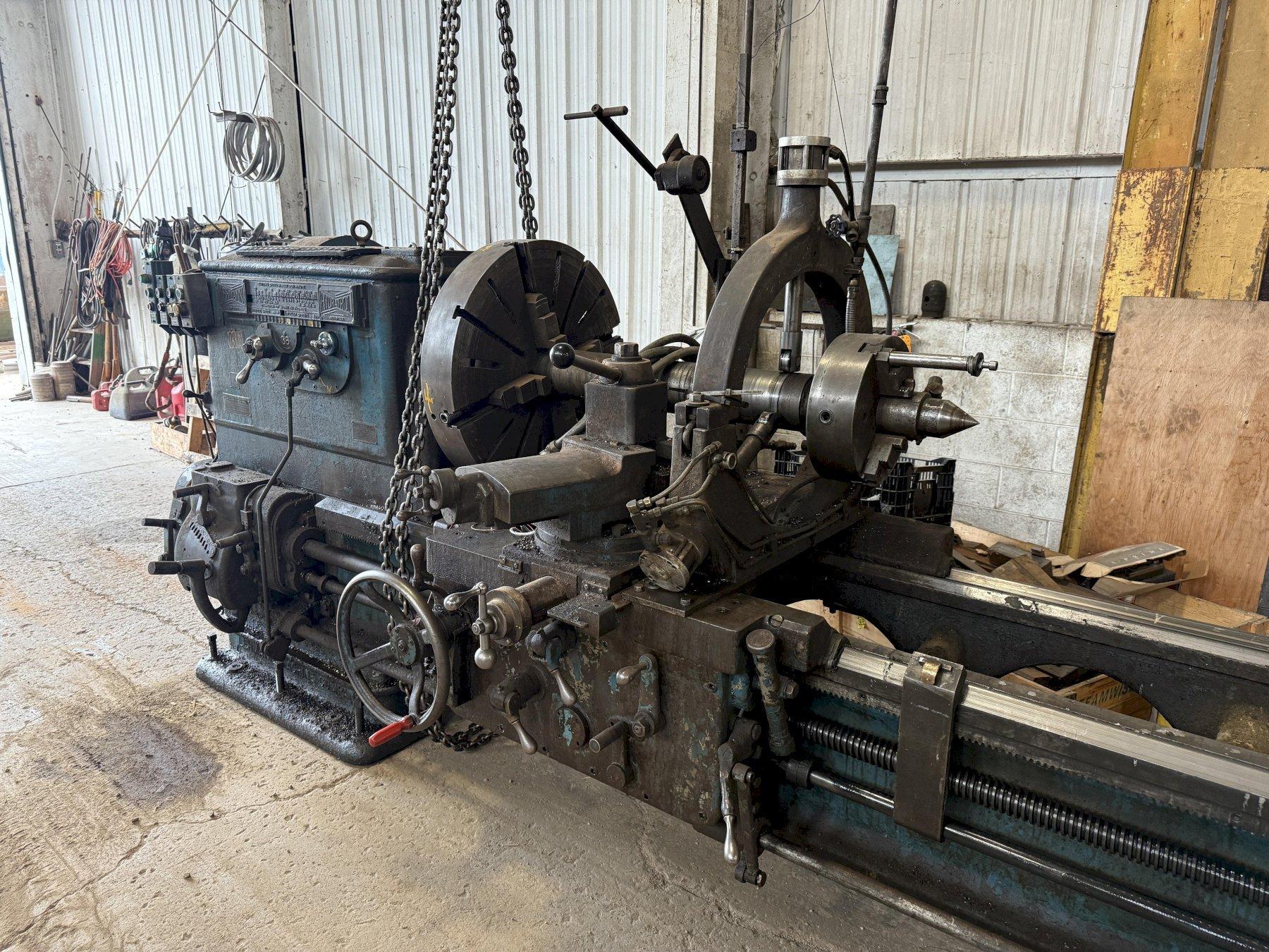Model ............................... 36 Swing Over Bed ...................... 37" Swing Over Ways ..................... 24" Distance between Centers ............ 35' (420") Dual Carriage ....................... Yes Spindle Bore ........................ 2.125" Spindle Speeds ...................... 10 TO 600 RPM Inch Threading ...................... Yes Feeds ............................... .006 to .640 IPR 4-Jaw Chuck ......................... 28" Steady Rests ........................ 4 Main Motor .......................... 30 HP G & P Belt Grinding Attachment: Model ............................... RGL4168 Capacity ............................ 4" x 168" Motor ............................... 15HP Jorgensen Motorized Chip Conveyor ... 16" |