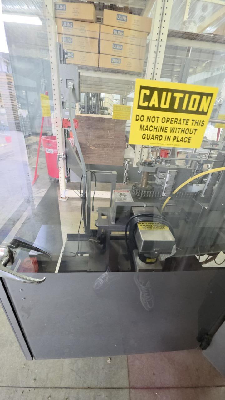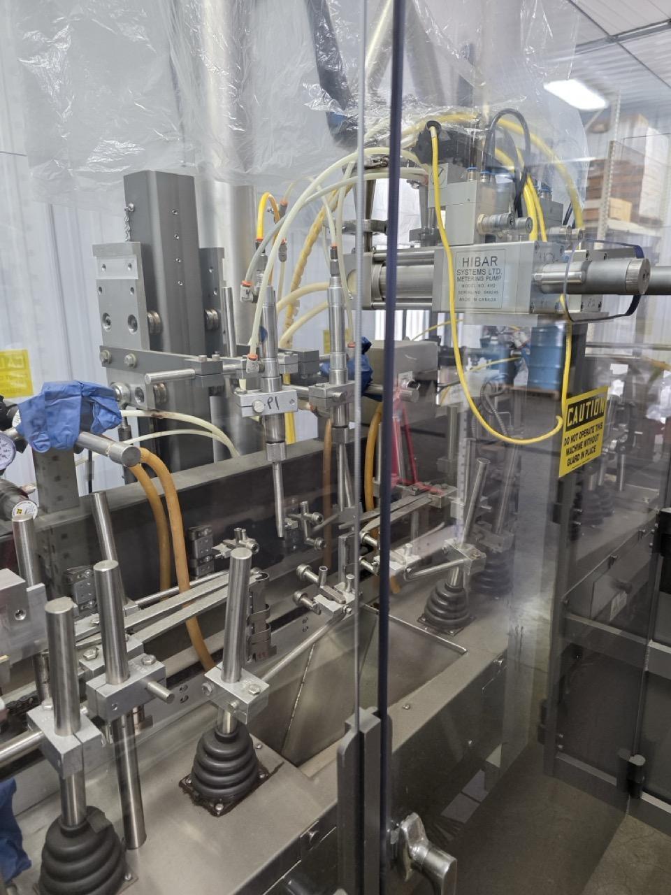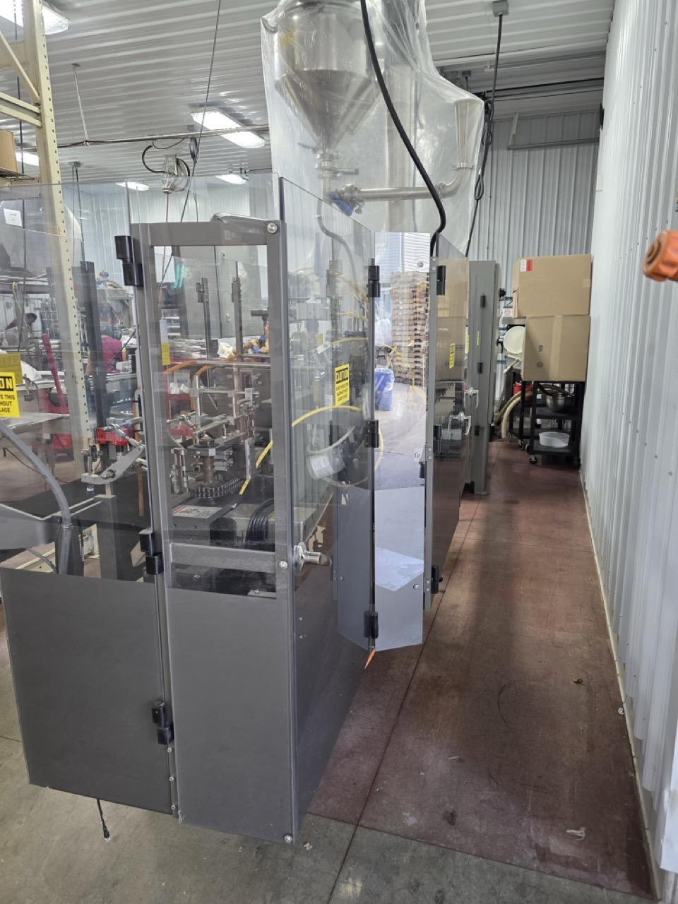 All specifications are assumed to be correct but must be confirmed by the purchasing entity.,This horizontal form fill and seal machine was previously used to package a viscous condiment into sachets All specifications are assumed to be correct but must be confirmed by the purchasing entity.,– Minimum pouch size: 4 x 4 – Maximum pouch size: 9 3/4″ x 13 1/2″ – Maximum gusset size: 3″ All specifications are assumed to be correct but must be confirmed by the purchasing entity.,– Electrical requirements: 480V, 60Hz, 50 Amp – Air requirements: 35 CFM, 80 PSI (Minimum), 3/4″ line minimum feed All specifications are assumed to be correct but must be confirmed by the purchasing entity.,– Designed to form, fill and seal a variety of products into a pouch made of laminated materials, it can also handle most thermo-sealing web materials – Maximum web roll diameter: 18″ – Specifically configured to package liquid in a 1-up or 2-up configuration – Runs up to 60 indexes / 120 pouches per minute 2-up (speeds dependent on filling variables) – Variable speed AC servo drive – Stainless steel ways – Operator safety guards with machine electrical interlock, front rear, and discharge end – Single point plow adjustment – Servo driven feed rolls – Registration – B&R controls – Two (2) normal and two (2) emergency stop switches – Machine “JOG” capability – Web fail and web jam shutdown – Vacuum opening at fill stations, with vacuum detect – Blow back at all vacuum stations – Servo torque limiter on the conveyor drive – Online slitter, 2-up – Bag reject for no vacuum/no fill – Offline indexing pouch counting conveyor – Low air pressure shutdown All specifications are assumed to be correct but must be confirmed by the purchasing entity. |