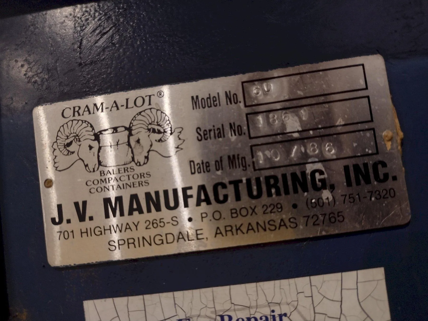 NEW ........................ 10/1986 MODEL ...................... 60 BALE SIZE .................. 60" x 30" x 48" BALE WEIGHT RANGE .......... 800 LBS -1000 LBS CYLINDER BORE .............. 6" CYLINDER STROKE ............ 44" SYSTEM PRESSURE ............ 2000 TO 2400 PSI COMPACTION FORCE ........... 56,550 TO 67,850 CYCLE TIME ................. 51 SECONDS FEED OPENING ............... 22" MOTOR ...................... 10 HP 78" LR x 38" FB x 142" TALL 4500 LBS |