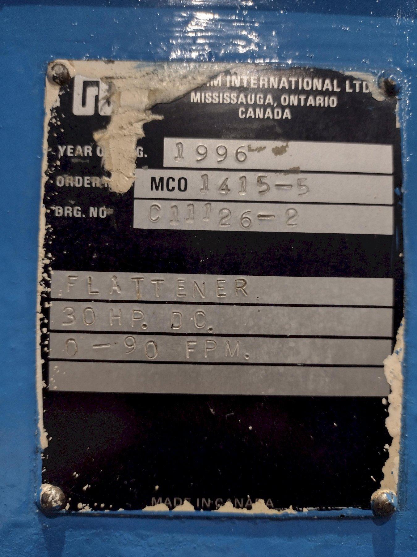 STOCK # 14555 Specifications: SERIAL ............... MCO1415-5 NEW .................. 1996 MODEL ................ FLATTENER CAPACITY ............. 24" WIDE X .25" ENTRY GUIDES ......... YES ENTRY PINCH ROLLS .... PNEUMATIC ENTRY ROLL DIAMETER .. 6" ROLLS ................ 7; 3 OVER 4 ROLL DIAMETER ........ 3.5" ROLL FACE ............ 26" BACK UP ROLLS ........ YES ADJUSTMENT POINTS .... 2 ADJUSTMENT ........... MANUAL SPEED ................ 0 TO 90 FPM BETWEEN HOUSINGS ..... 27" MOTOR ................ 30 HP DC **Temporary Specifications Subject to Revisions** **PRICE QUOTED AS IS WHERE IS SUBJECT TO PRIOR SALE** **ALL SPECIFICATIONS ARE SUBJECT TO VERIFICATION** |