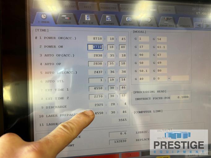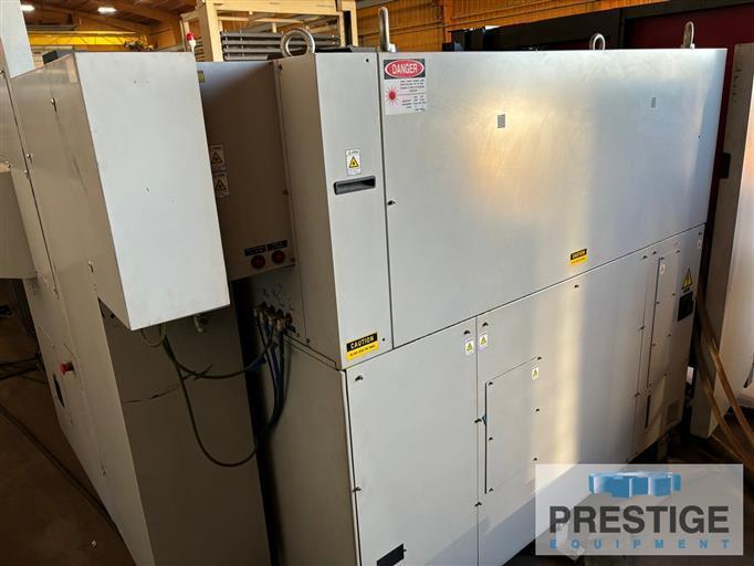 | CAPACITY: Maximum Power.......................... 2700 Watts 2700 Watts Maximum Sheet Size 60.03" x 120.07" X-Axis Stroke 122.05" Y-Axis Sroke 61.02" Z-Axis Stroke 5.90" Maximum Work Piece Weight 2,050 Lbs. Maximum Feed Rate 1,968 IPM Rapid Travel Speeds (Simultaneous) 5,550 IPM Approximate Dimensions 429" x 95" x 128" Approximate Machine Weight 28,090 Lbs. Equipped With: Mitsubishi M700CNC Control Mitsubishi 27XF Resonator Automatic Pallet Changer Automatic Focus Adjustment Quick Change Lens Cartridge System Jet Pierce Technology Chiller Camfil Dust Collector HOURS: 8,710 Power On 4,550 Cutting Hours NOTE: Inspect in Plant Under Power |