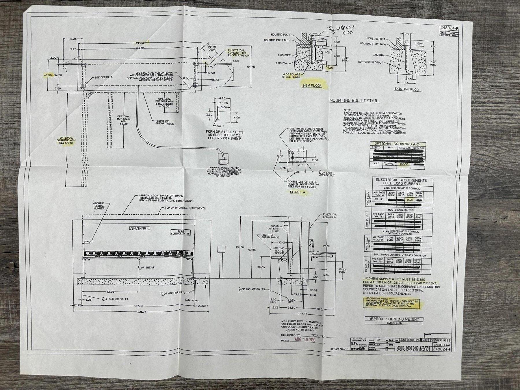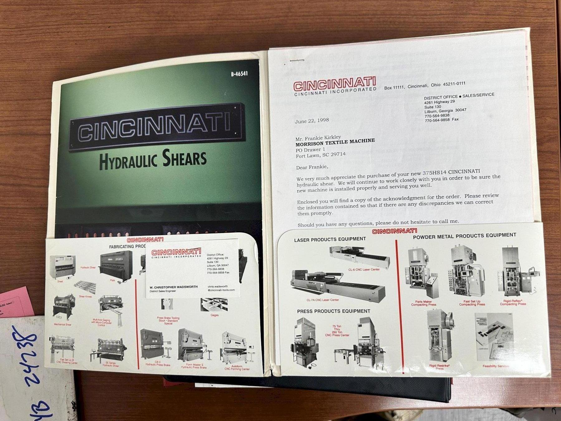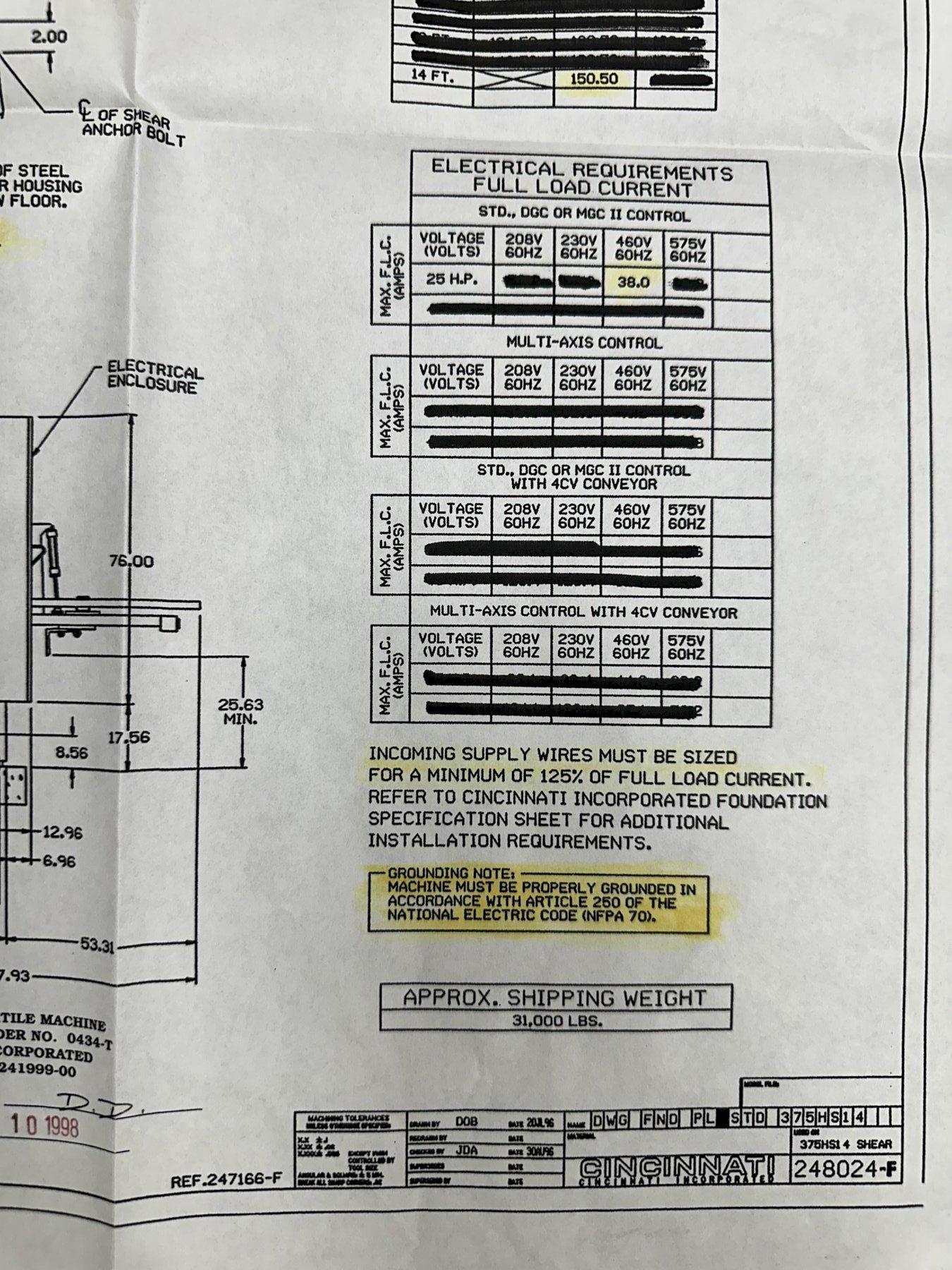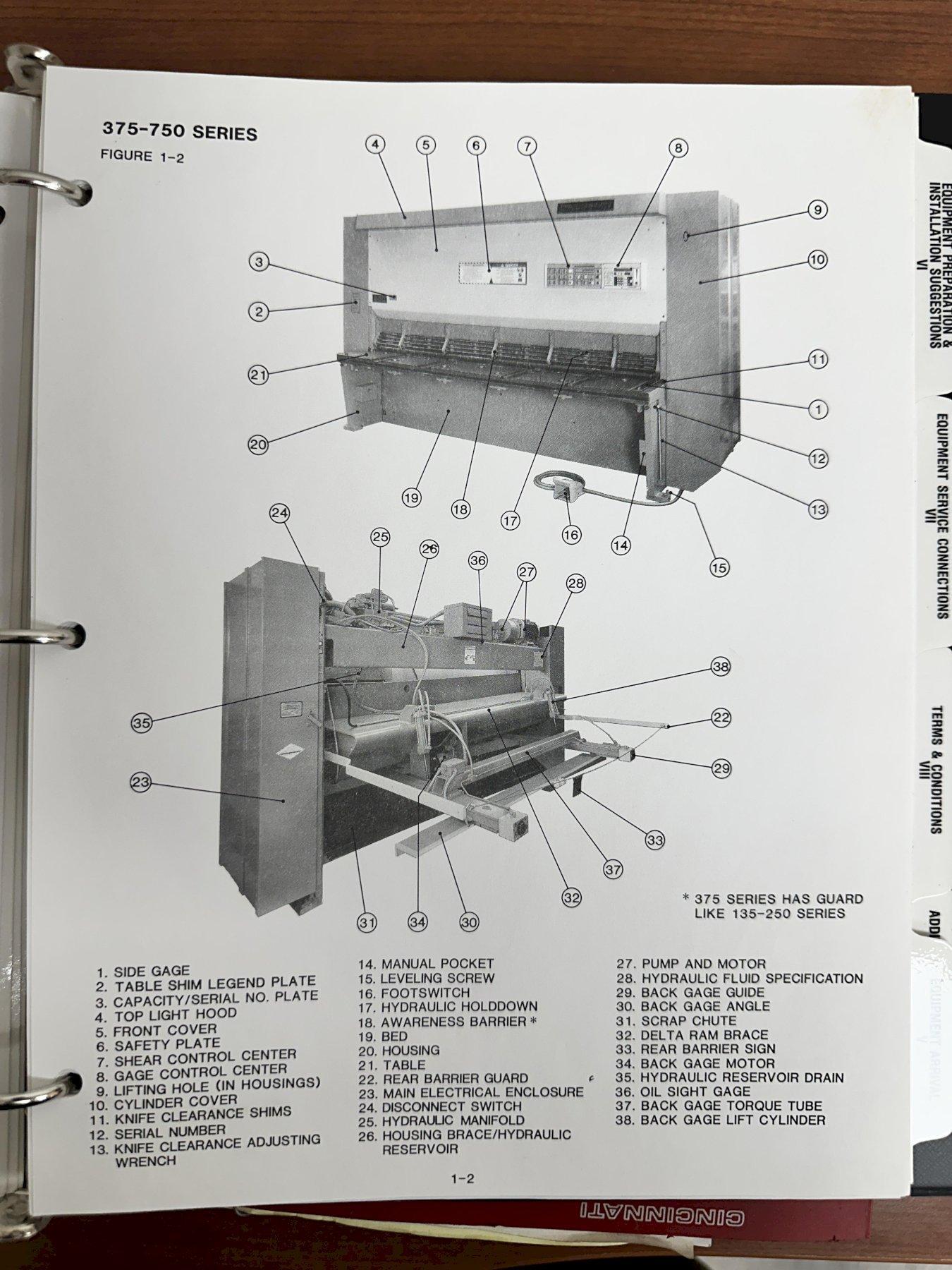 NEW ................................. JUNE 1998 MODEL ............................... 375HSX14' CAPACITY ............................ 14 FT. X 3/8" MILD STEEL TYPE ................................ FLOOR STANDING (NO PIT) LENGTH OF KNIVES .................... 172" RAKE ANGLE .......................... 7/16" DISTANCE UNDER HOLDDOWNS ............ 5/8" NUMBER OF HOLDDOWNS ................. 17 FORCE OF HOLDDOWNS .................. 1925 TONS SPEED, SPM .......................... 7 TO 41 FLOOR TO TOP OF BED ................. 36" FRONT OPERATED BACK GAUGE ........... 48" PUSHBUTTONS ......................... FAST/SLOW-REVERSE/READOUT SQUARING ARM ........................ 12' NUMBER OF STOCK SUPPORT ARMS ........ 2 ELECTRIC FOOT SWITCH ................ YES START / STOP PUSH BUTTONS ........... YES UP /DOWN SELECTOR SWITH FOR GAUGE ... YES STROKE COUNTER ...................... YES KEY SELECTOR SWITCH ................. INCH/OFF/SINGLE STROKE/CONTINUOUS TRANSFER BALLS (TOP OF TABLE) ....... YES (6) DOVETAIL SLOTS (TOP OF BED) ..... YES DOVETAIL SLOT (FRONT OF BED) ........ YES MATERIAL THICKNESS & LENGTH KNOBS ... YES REAR PARTS CHUTE .................... YES BACK GAUGE MOTOR .................... 1/2 HP HYDRAULIC PUMP MOTOR ................ 25 HP |