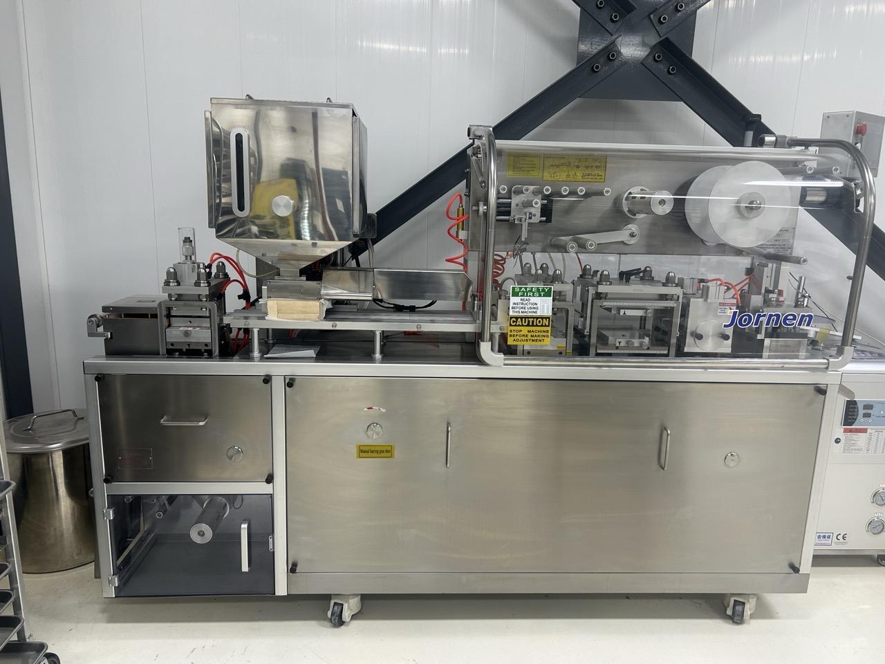 Pharmaceutical-grade coating machine designed for tablets and pills. This Jornen BG-80 model features a perforated drum, full stainless steel housing, and touchscreen HMI, commonly used in GMP-compliant facilities.