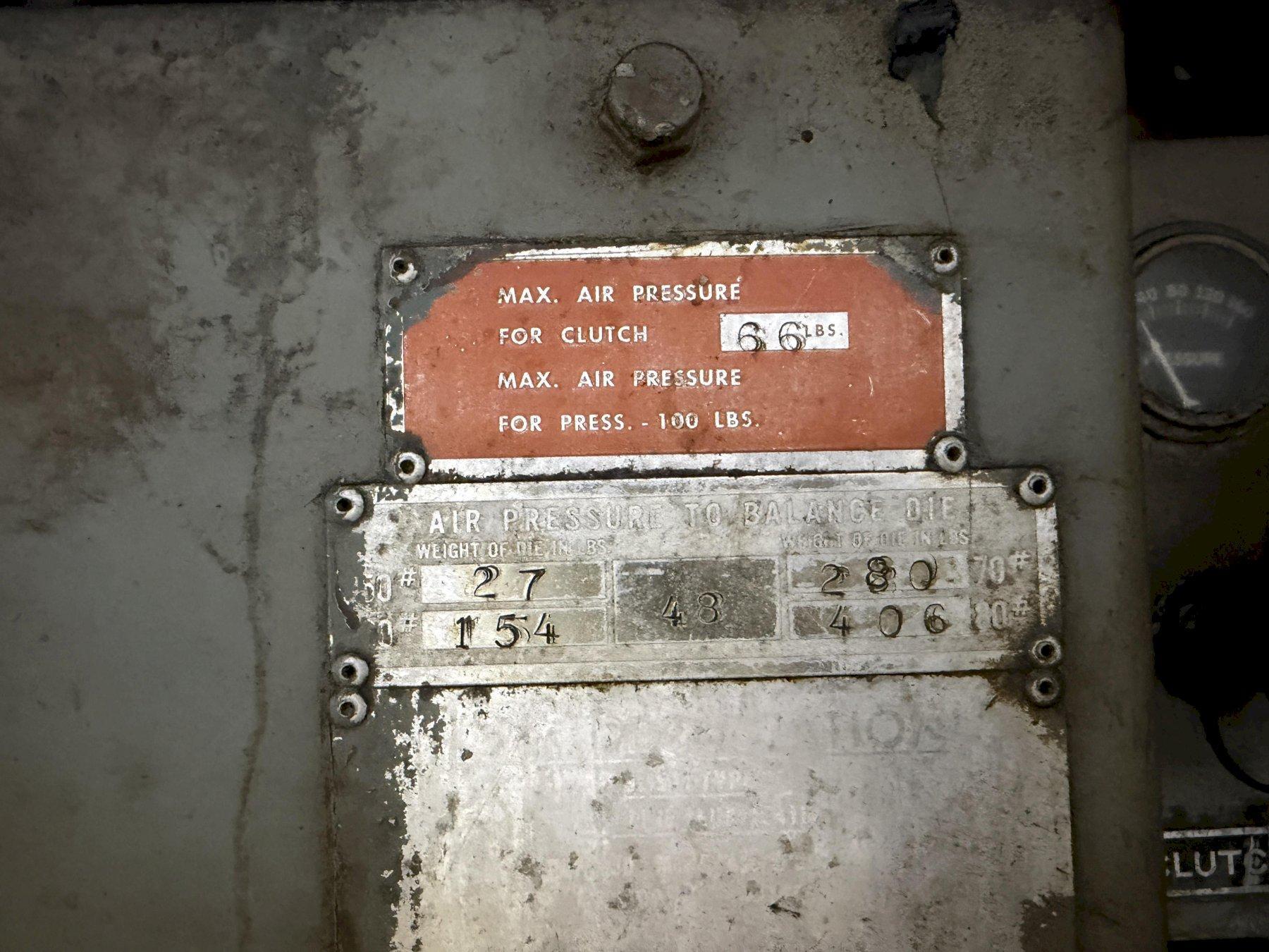 NEW 1978 MODEL C-60 CAPACITY 60 TON STROKE 4" ADJUSTMENT 3" SHUT HEIGHT 14.25" SPEED 55 SPM BACK GEARED AIR CLUTCH & BRAKE BED CUSHION RAM AREA 17" X 12" HOLE IN RAM SLIDE 2" X 3" BED AREA 32" X 22" BOLSTER 1.5" THICK THROAT 12" BETWEEN FRAMES 15" MOTOR 7.5 HP |