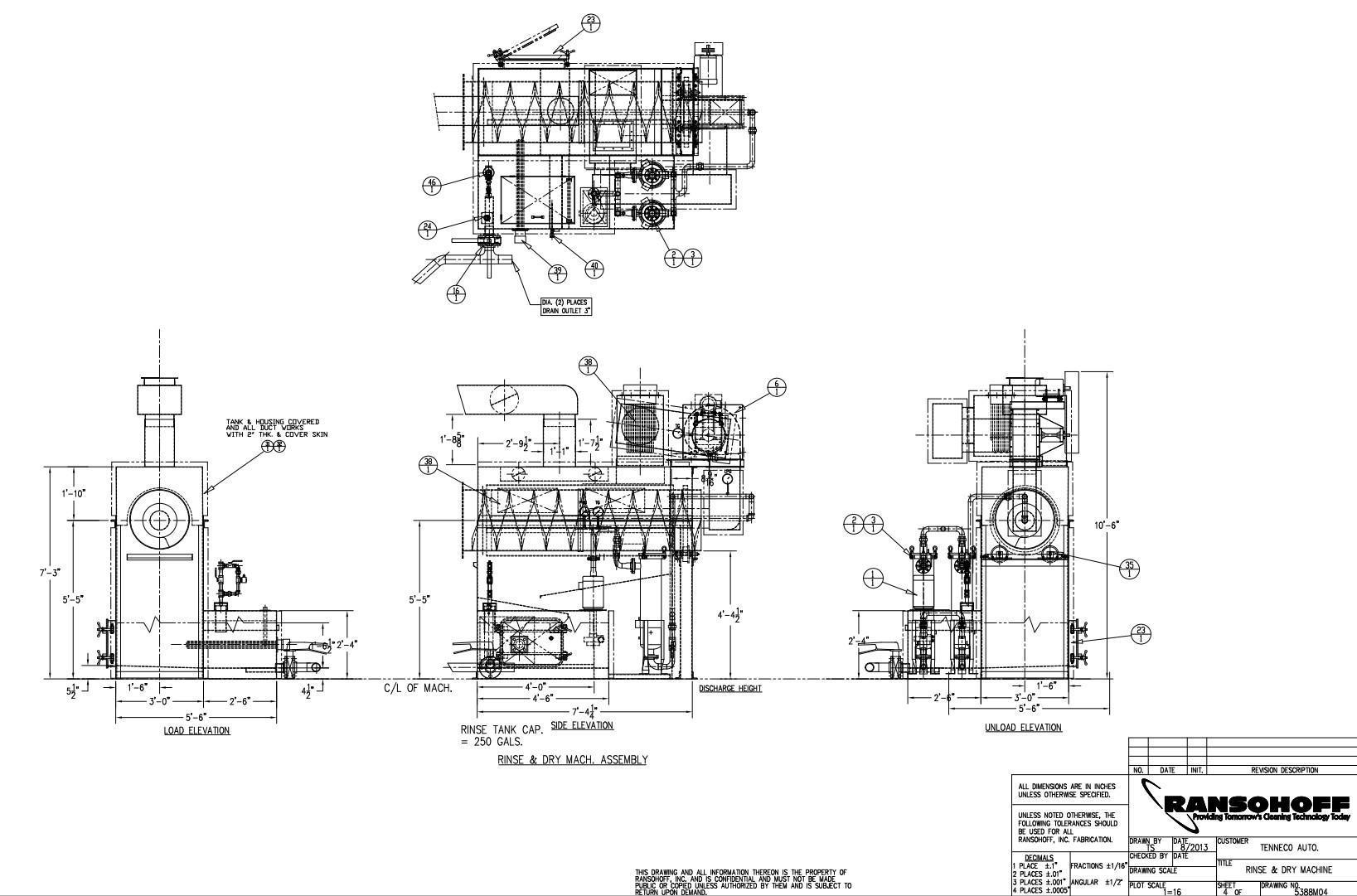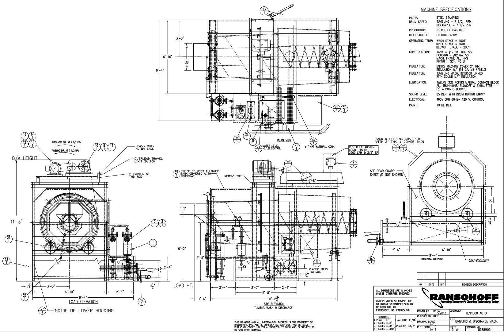 COMPLETE ROTARY DRUM WASHER & RINSE/DRY SYSTEM Parts: Steel Stampings Drum Speed: 7.5 RPM tumbling / 7.5 RPM discharge Production Rate: 170 CFH Maximum Load Capacity: 1,800 lb batch Operating Temperature: Wash Stage: 160°F Rinse Stage: 160°F Heat Source: Electric, 460V Sound Level: 85 dB (drum running empty) MECHANICAL CONSTRUCTION Washer Housing: 12-gauge hot rolled steel Dryer Housing: 14-gauge aluminum Tank Construction: 12-gauge hot rolled steel Frame & Hood: All hot rolled steel Insulation: Washer: 2" fiberglass panels Dryer: 4" fiberglass panels ROTARY BATCH DRUM ASSEMBLY Drum Type: Hexagon Batch Processing Drum Drum Size: 48" diameter x 72" length Material: 3/4" Hot Rolled Steel Drum Head: Integrated discharge chute Retaining Cone: 60" diameter x 80" length, 3/8" HRS Running Bands Load End Running Band: 3-1/4" x 2-3/4" 55-1/4" ID 58" Finished OD Discharge End Running Band: 3-1/2" x 2-3/4" 61-1/4" ID 64" Finished OD Drive Interface Plate Sprocket: #881 Chain 78 Tooth 1" Thick Trunnions (4) Heavy-duty 14" trunnions complete with shafts and bearings INTERNAL FLIGHTS & TUMBLING SYSTEM The batch drum shall include a fully integrated internal tumbling flight system designed to provide controlled part agitation, lift, tumble, and forward conveyance through the wash process. Flight Construction Material: Hot Rolled Steel Flat Bar Flight Size: 1" x 1/4" HRS Flat Bar Configuration: Continuous spiral pattern through wash section Quantity: Multiple spiral flights with lead-in and discharge transition baffles Attachment: Fully welded to drum shell Flight Function Provides uniform tumbling action Controls dwell time Promotes part separation and fluid drainage Prevents part nesting Improves washing and deburring efficiency SEPARATOR SCREEN Separator Screen Size: 24-1/2" x 74" Heavy-duty perforated steel construction Integrated mounting flange at unload end Designed to mate directly to rinse-dryer drum flange Welded structural support ribs Drain baffle system under screen Perforation Pattern Hole Size: 3/4" diameter Pattern: Staggered TANK SYSTEM Wash Tank Capacity: 475 gallons Rinse Tank Capacity: 250 gallons Sloped bottoms, clean-out ports, overflow and drain connections Water level control and overflow outlet HEATING SYSTEM Electric immersion heating system: Wash Tank Heaters: 120 kW Rinse Tank Heaters: 60 kW Rust Prevent Heaters: 36 kW Total Connected Heater Load: 216 kW PUMPING SYSTEM Wash Pump: 20 HP Rinse Pump: 15 HP Rust Prevent Pump: 10 HP Sump Pump: 5 HP Return Pump: 5 HP All pumps skid mounted with motors, couplings, strainers and isolation valves. DRYING & BLOW-OFF SYSTEM (2) 15 HP blow-off blowers (1) 20 HP dryer circulation blower High-velocity air knives Insulated drying tunnel Exhaust outlet and fresh air inlet ELECTRICAL SYSTEM Incoming Power: 460V / 3 Phase / 60 Hz Total Connected Load: 460 kW PLC control system Motor starters and heater contactors Safety interlocks and emergency stops NEMA industrial enclosure DIMENSIONS Overall System Length: Approx. 27 feet Overall Height: 11'-9½" Unload Elevation Width: 5'-0" Unload Elevation Depth: 2'-6" LUBRICATION Centralized lubrication block Drum trunnions, drive system, and blower bearings tied into common lubrication system |