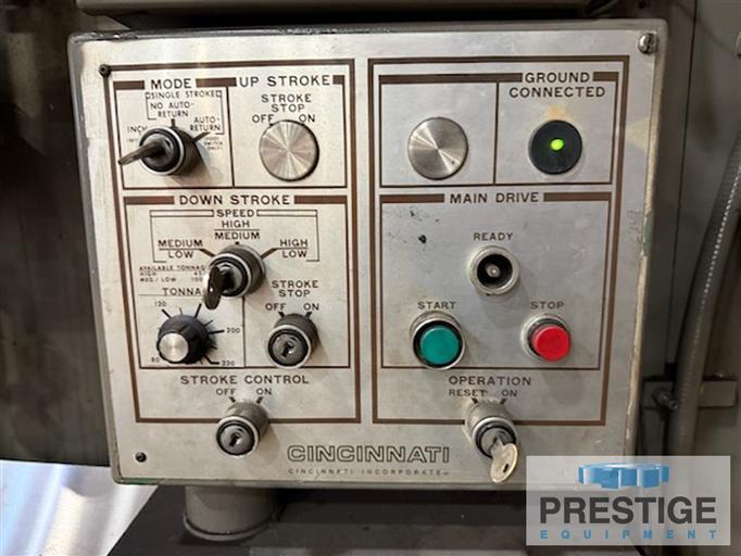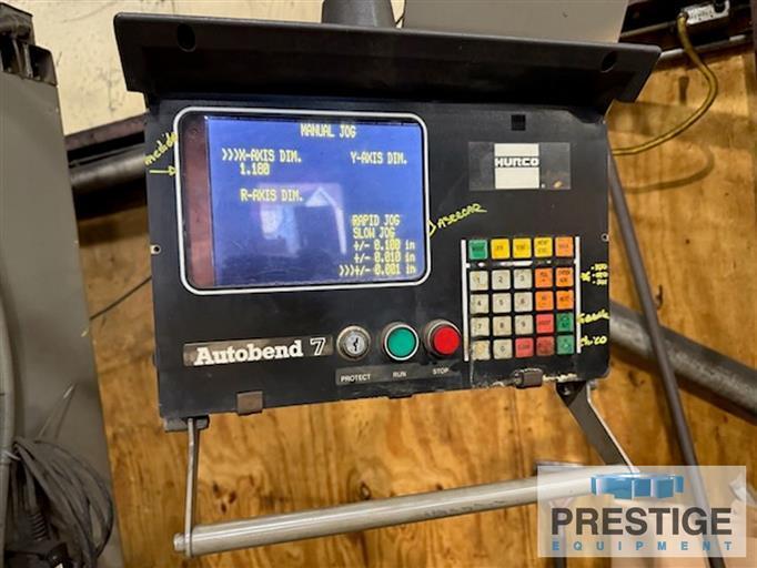 Maximum Tonnage Capacity 230 Ton Overall Length Of Bed & Ram 12' Distance Between Housings 10'6" Throat Depth 8" Bending Capacity 1/4" x 12' Stroke Length 10" Open Height 17" Shut Height 7" Main Motor 25 HP Speeds, Approach 101 IPM Speeds, Form 14-49 IPM Speeds, Return 95 IPM Overall Dimensions 168" x 48" Machine Height 123" Approximate Weight 30,200 lbs Equipped With: Hurco AB7 2-Axis Dual Screw Back Gauge Dual Electric Foot Switches Pedestal Palm Button Stations ISB Merlin 4000 Safety Curtains Rear Safetly Cage Pdf Manuals Interlocked Construction Clevis Mounted Self Aligning Cylinders |