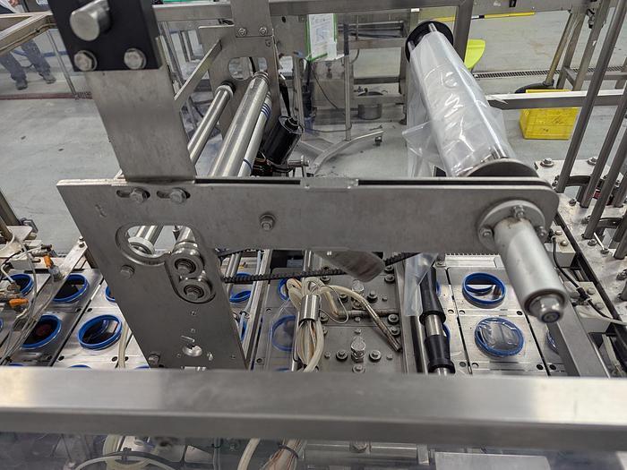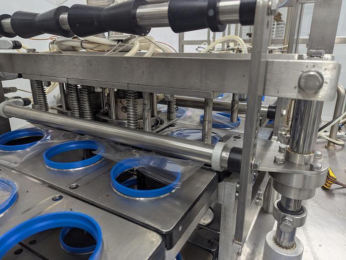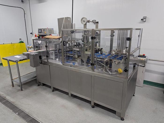 All specifications are assumed to be correct but must be confirmed by the purchasing entity.,This Pack Line PX6-3 is a stainless steel inline rotary cup filling and sealing machine, designed for medium-speed packaging applications. Built in 2007, the unit includes a 6-up configuration for high throughput, Allen-Bradley PLC interface, heat-seal film system, and precise dosing functionality. Ideal for dairy, sauces, or other semi-liquids in round plastic cups. All specifications are assumed to be correct but must be confirmed by the purchasing entity.,Key Features and Specifications All specifications are assumed to be correct but must be confirmed by the purchasing entity.,Fill Type: Inline piston or gravity (hoses visible suggest semi-liquid dosing) All specifications are assumed to be correct but must be confirmed by the purchasing entity.,Stations: Denesting, Filling, Film Placement, Sealing, Discharge All specifications are assumed to be correct but must be confirmed by the purchasing entity.,Seal Method: Film roll-fed heat sealing All specifications are assumed to be correct but must be confirmed by the purchasing entity.,Film Handling: Reel mount with roller tension system All specifications are assumed to be correct but must be confirmed by the purchasing entity.,Capacity: 6-cup per cycle throughput All specifications are assumed to be correct but must be confirmed by the purchasing entity.,Construction: Full stainless frame and guarding All specifications are assumed to be correct but must be confirmed by the purchasing entity.,Safety: Emergency stop & safety interlocks All specifications are assumed to be correct but must be confirmed by the purchasing entity.,Cup Diameter: Approx. 3.75″ – 4.0″ (tape measured in tray) All specifications are assumed to be correct but must be confirmed by the purchasing entity.,Operator Interface: Allen-Bradley PanelView 300 Micro All specifications are assumed to be correct but must be confirmed by the purchasing entity.,Temperature Control: 4x Omron E5CN digital thermostats All specifications are assumed to be correct but must be confirmed by the purchasing entity.,Utilities: 3-phase 220V, 2.5kW, 50Hz All specifications are assumed to be correct but must be confirmed by the purchasing entity. |