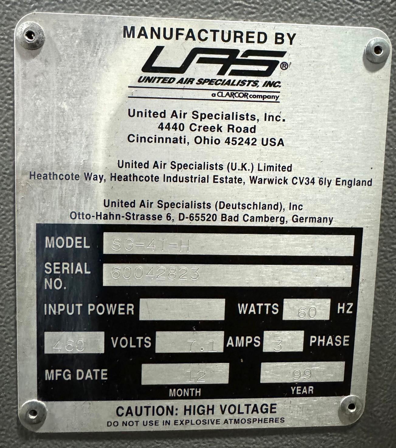 MODEL: SG-4T-H SERIAL NUMBER: 60042823 GENERAL SPECIFICATIONS 4000 CFM (4) Electrostatic Cells Two-Stage Filtration Fluid Drain 5 HP Motor, 208/230/460/60/3 (Presently 460 Volt) Unit is equipped with steel mounting frame/bracket for vertical I-beam mounting. Mounting frame can be easily removed for other mounting/hanging options. F.O.B. Cincinnati, Ohio ALL SPECIFICATIONS SUBJECT TO VERIFICATION BY PURCHASER |