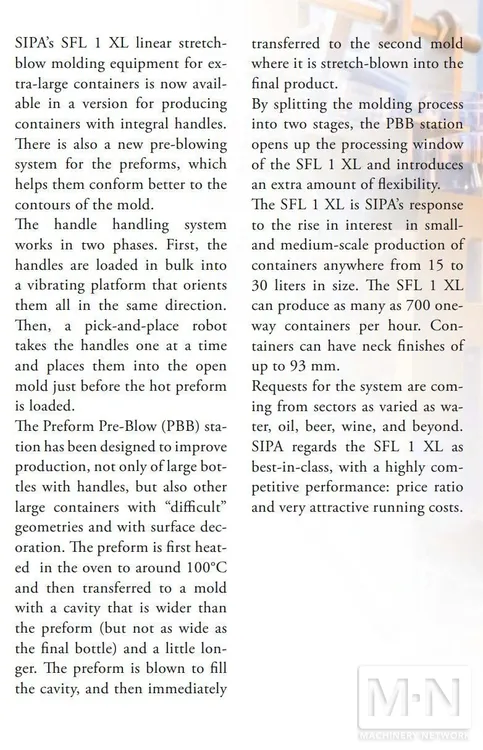 OverviewDescriptionSIPA MODEL SFL 1 XL INJECTION BLOW MOLDING MACHINE MFG 2015 ( 2) AVAILABLE 30 LITER MAX BOTTLE CAPACITY