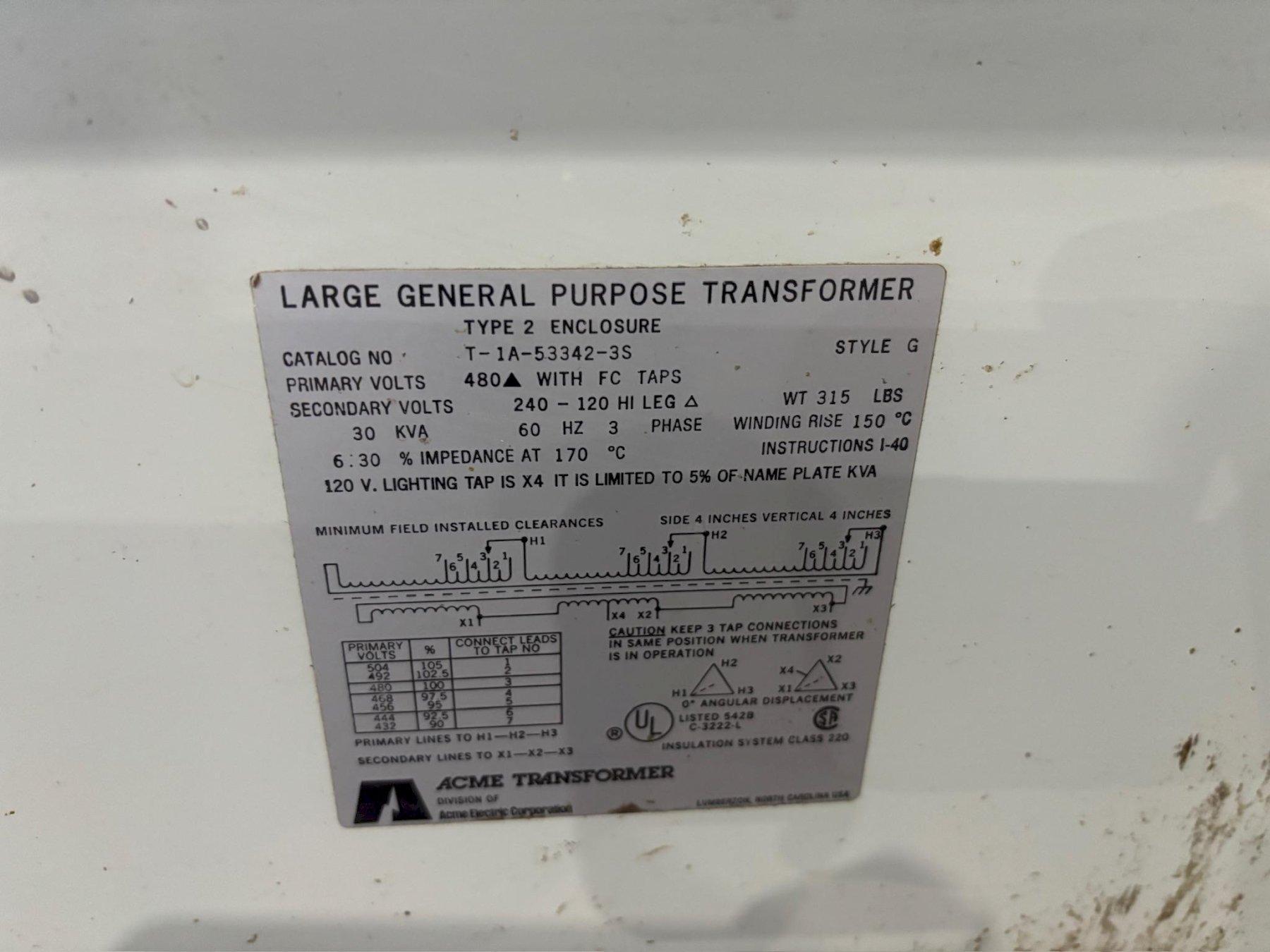 CAPACITY 30 KVA 60HZ 3 PHASE PRIMARY VOLTS 480 DELTA SECONDARY VOLTS 240-120 HIGH LEG DELTA STYLE G |