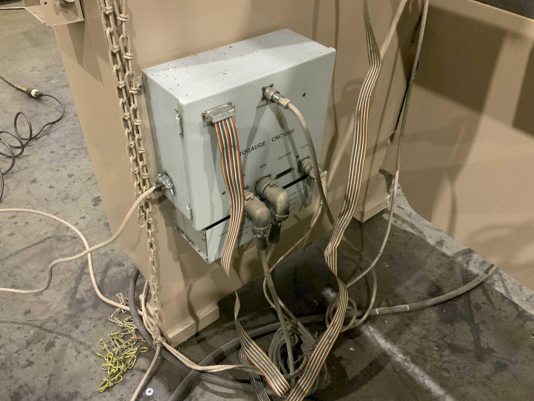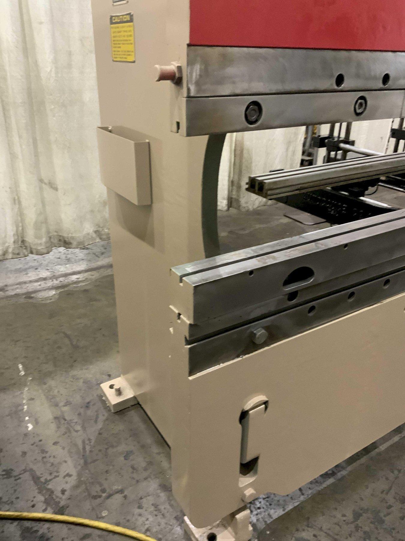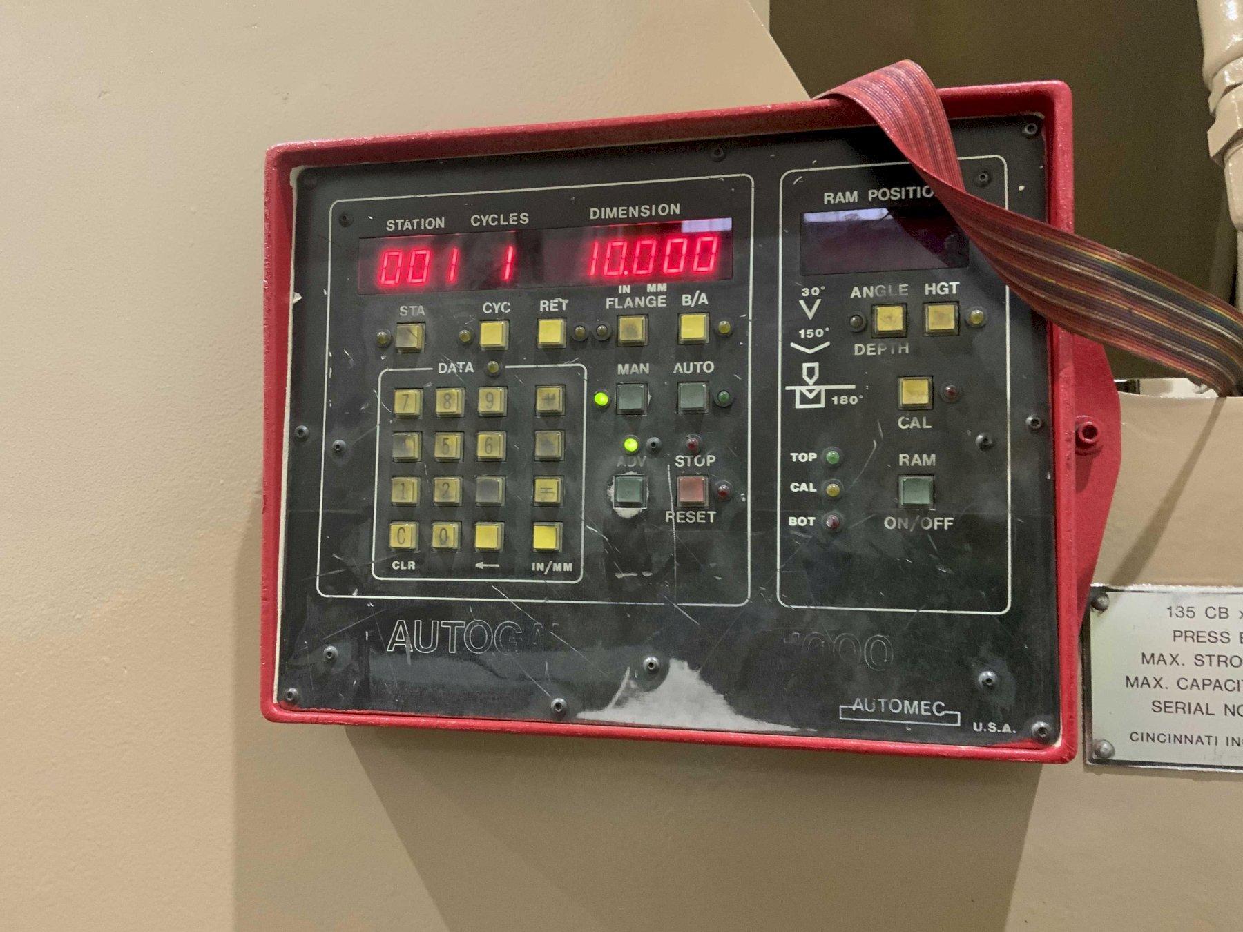SERIAL .............................. 45803 MODEL ............................... 135CB X 8 YEAR NEW ............................ 1990 OVERALL LENGTH OF BED ............... 120" (10') DISTANCE BETWEEN HOUSINGS ........... 102" (8'6) STROKE .............................. 8" MAXIMUM DAYLIGHT .................... 15" MINIMUM DAYLIGHT .................... 7" THROAT .............................. 7" RAM SPEED RAPID ADVANCE ............. 136 IPM RAM SPEED MEDIUM ADVANCE ............ 65 IPM RAM SPEED LOW ADVANCE (PRESSING) .... 16 IPM RAM SPEED RETURN .................... 122 IPM RAM MILLED AND DRILLED FOR ANGELS ... YES BED MILLED AND DRILLED FOR ANGLES ... YES CNC BACK GAUGE ...................... AUTOMEC 1000 FLOOR STANDING ...................... YES PALM BUTTONS ........................ YES MAIN MOTOR .......................... 25 HORSEPOWER |