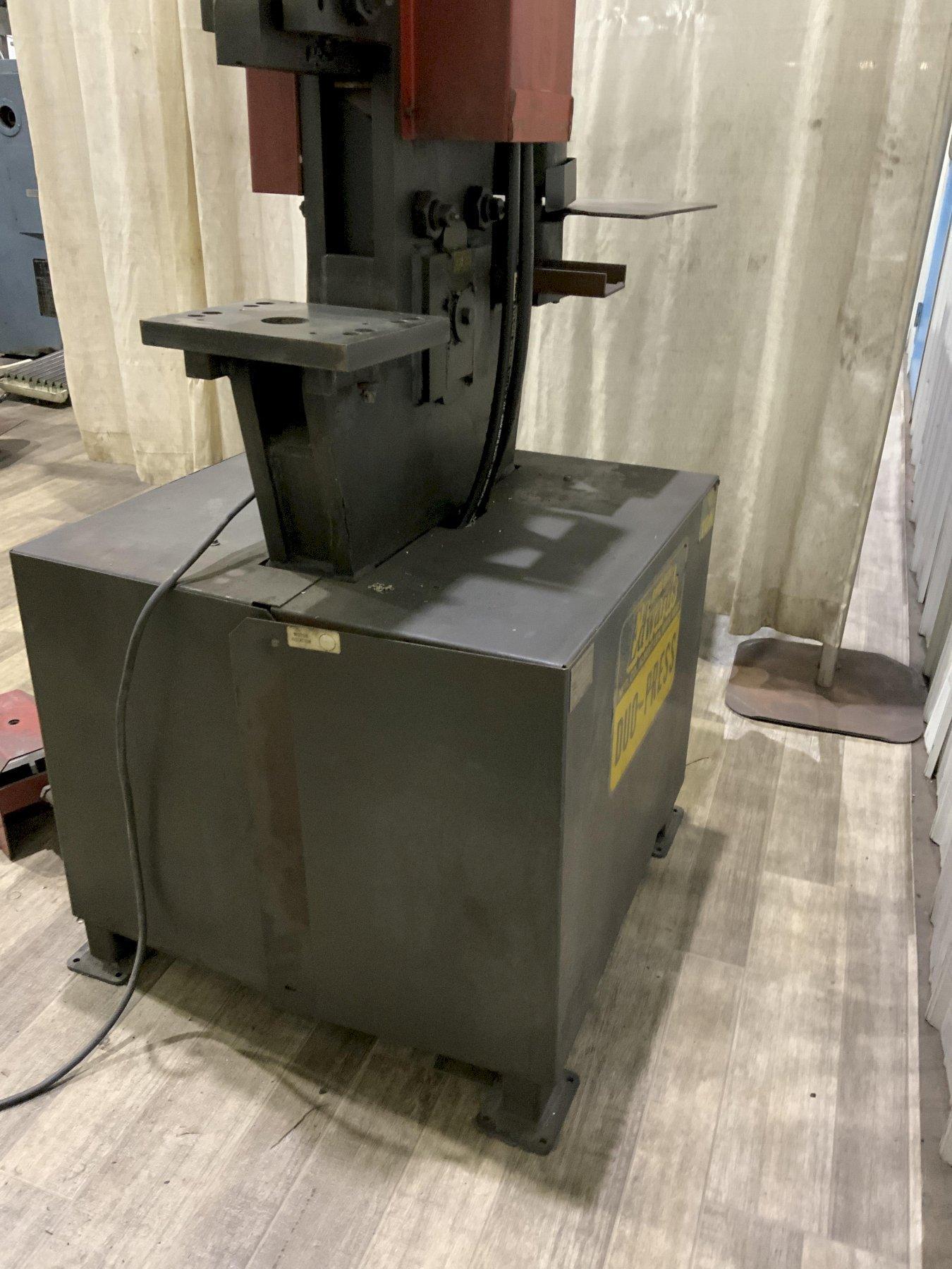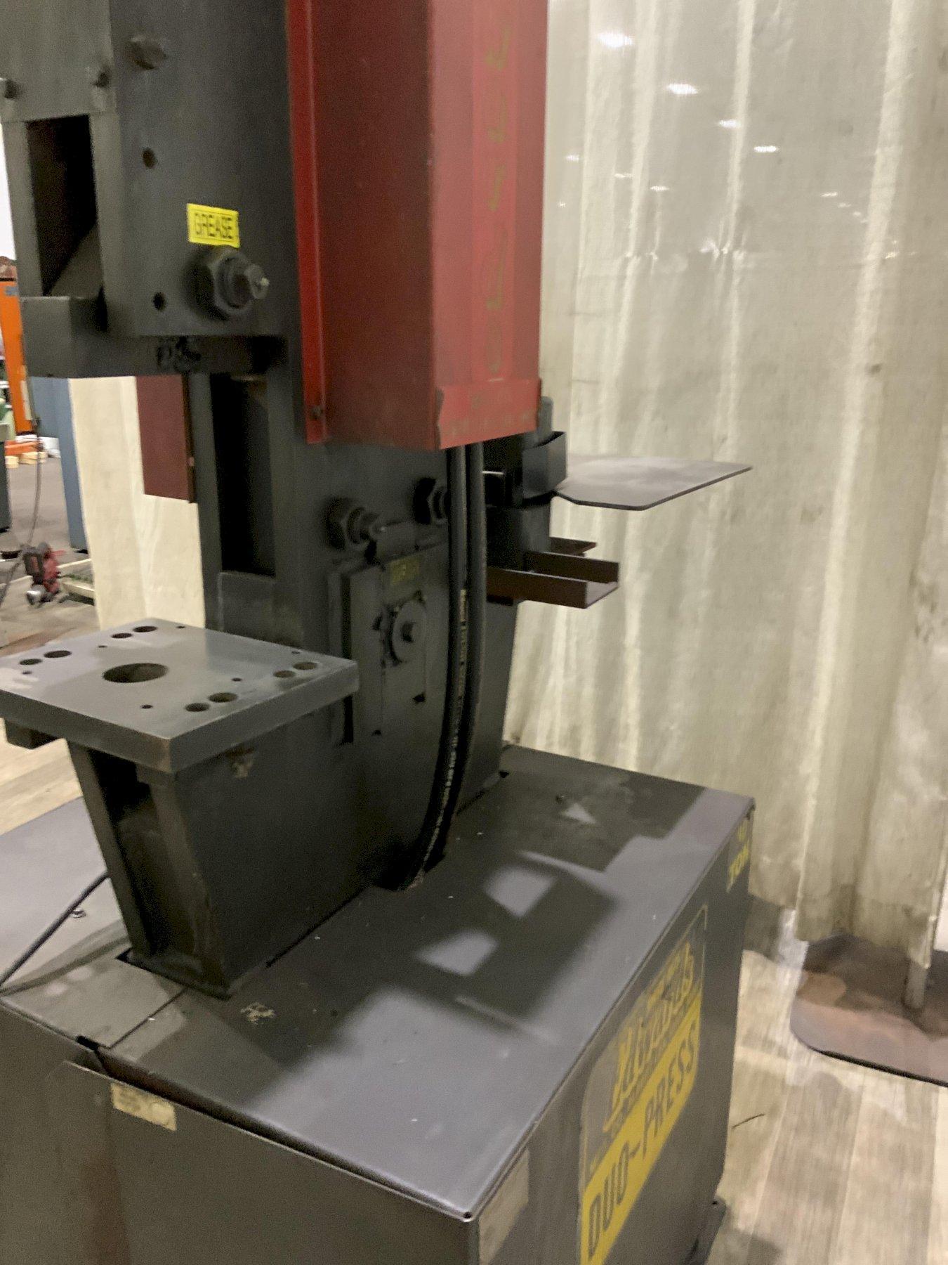 SERIAL ........................ 01273001 MODEL ......................... DUO-PRESS CAPACITY ...................... 30 TONS STROKE ........................ 3" PUNCHING CAPACITY ............. 1" THRU 3/8" DEPTH OF THROAT ............... 5-1/2" OPEN HEIGHT ................... 10" CLOSED HEIGHT ................. 7" NOTCHER ....................... 3" X 3" ELECTRIC FOOT PEADL ........... YES MOTOR HORSEPOWER .............. 3 |