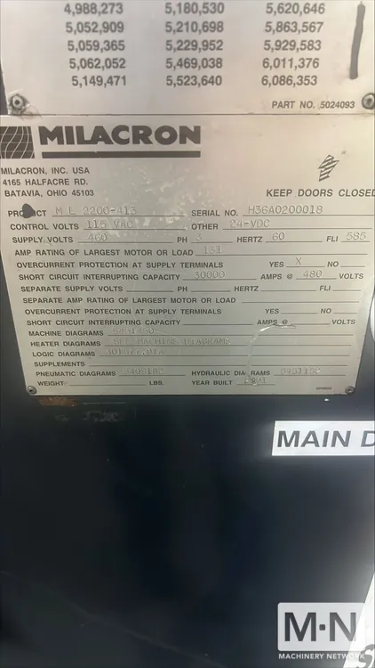 OverviewDescription2200 TON 413 OZ CINCINNATI MODEL ML2200-413 INJECTION MOLDING MACHINE MFG 2001 CAMAC XTREEM ST CONTROL