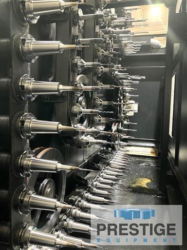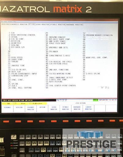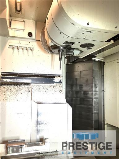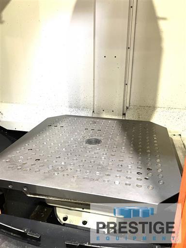 X-Axis 73.82" Y-Axis 41.73" Z-Axis 52.95" B-Axis, 150 Degree (Contouring) -30 Deg. to 120 Deg. C–Axis .001 Deg. Pallets (2), 39.4" x 39.4" Work piece Dimensions 49.21" X 49.21" Weight Capacity 4784 pounds Milling Spindle Speed 10,000 RPM / 2 Windings Spindle Taper CAT 50 Horsepower 50 Int. / 40 Cont. Horsepower 50 Int. / 40 Cont. Tool Changer Capacity 120 ATC Tool Diameter 5.31" / 10.24" Tool length 19.69" Tool Weight 66 Pounds Rapid Traverse X, Y, Z Axis 1653 IPM B Axis 30 RPM C Axis 25 RPM Machine Weight 85,800 pounds Equipped With: Mazatrol Matrix 2 CNC conversational control w / 15" display 120-Station Automatic Tool Changer 2-Station Automatic Pallet Changer (2) 39" Square Pallets 1000 PSI high pressure coolant through spindle w / Mazak Superflow V8M Pump Manual pulse generator Automatic Tool eye Heidenhein linear scales X, Y, Z Renishaw NC4 laser tool measurement Renishaw H/V OMP60 probe ConSep chip conveyor system Coolant washdown at operator and pallet load stations |