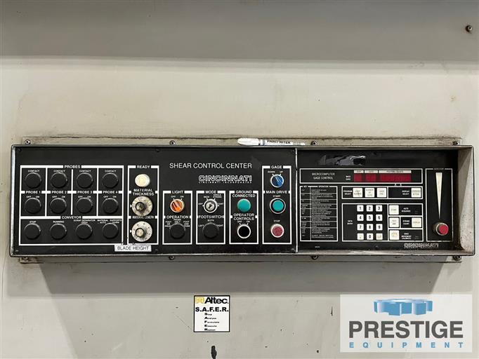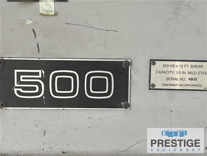 Shearing Capacity 1/2" Shearing Length 12' Length Between Housings 12' 3" Back Gauge Range 48" Throat Gap 18" Strokes Per Minute (Full Length) 16 Number Of Holdowns 15 Main Motor 40 H.P. Approximate Weight 28,600 Lbs. Machine Electrics 460/3/60 Equipped With: Cincinnati Shear Control Center 12' Squaring Arm Electric Foot Switch |