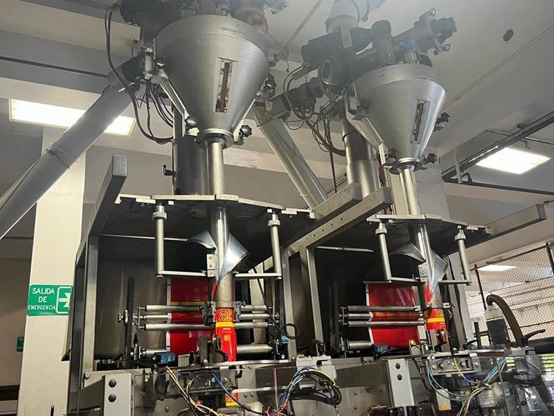 All specifications are assumed to be correct but must be confirmed by the purchasing entity.,– Previously used for filling 8 oz and 16 oz block bottom coffee bags with offset vertical fin seal and corner creasing and gable top gusseted top fin at 80 bpm All specifications are assumed to be correct but must be confirmed by the purchasing entity.,Includes: (2) Rovema SDX75 Auger Fillers – Standard hopper – Stirring unit with variable-control for the dosing of free-flowing, powdery and non-free flowing products. – For volume range: 2,0 – 5.500 ccm – Auger diameter: 14 mm – 75 mm – Mechanical accuracy: 0.05° degrees – Mounting column, manual adjustable – servo-dosing auger drive – product infeed hopper 50 l – level control – stirrer with separate drive – control and performance electronic – prepared for tendency control – synchronization unit – wiring to the vertical machine – central operation via display at the vertical machine All specifications are assumed to be correct but must be confirmed by the purchasing entity.,(2) Horizontal feed screws, 80 and 140 l/min conveying capacity All specifications are assumed to be correct but must be confirmed by the purchasing entity.,(2) Product catch trays in mild steel-execution mounted at machine frame to protect film infeed. All specifications are assumed to be correct but must be confirmed by the purchasing entity.,(2) Forming parts: 155 mm for 14 and 16 oz bags (2) Forming parts: 130mm for 8 oz bags All specifications are assumed to be correct but must be confirmed by the purchasing entity. |