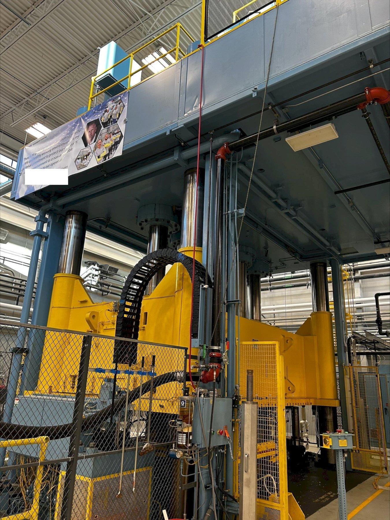 Williams & White Model H-4000-180-96 Downacting 4000 tons capacity 60" Stroke 100" Daylight open 40" Shut Height 226"LR x 96" Lower Platen and Ram Area 182.75" LR x 50.75" Area Between posts 20" floor to top of bolster 1" T-slots @ 6" centers Speeds: -1000-1500 IPM Fast close -25-250 IPM intermediate pressing (Up to 1000 Ton) -30-200 IPM stripping -900 IPM fast opening -7-70 IPM pressing without Accumulator -360 IPM max with press with Accumulator Motor & Controls: - Allen Bradley PLC 540 Controller -Delta Motion Controller for Accumulator Drive system -HST Data acquisition System-16 Analog and 16 digital channels -Allen Bradley Model 1400E Panelview (4) 250 H.P. Motors with Allen Bradley smart controllers on each (4) oil gear PVV 540 Pumps (4) PVWH pumps for cooling Filtration & tooling Manifold consists of oil gear & vickers Equipment and Features. 6" Thick T-slotted Bolster plate 1" T-Slots on @ 6" centers Die Lifter system Servo Filter system Trabon Grease Lube System Overall estimated dimensions: 276"LR x 156" FB x 482" above floor. 91" pit Cat walk above press for easy access to Hydraulics 725,000 approximate weight overall |
