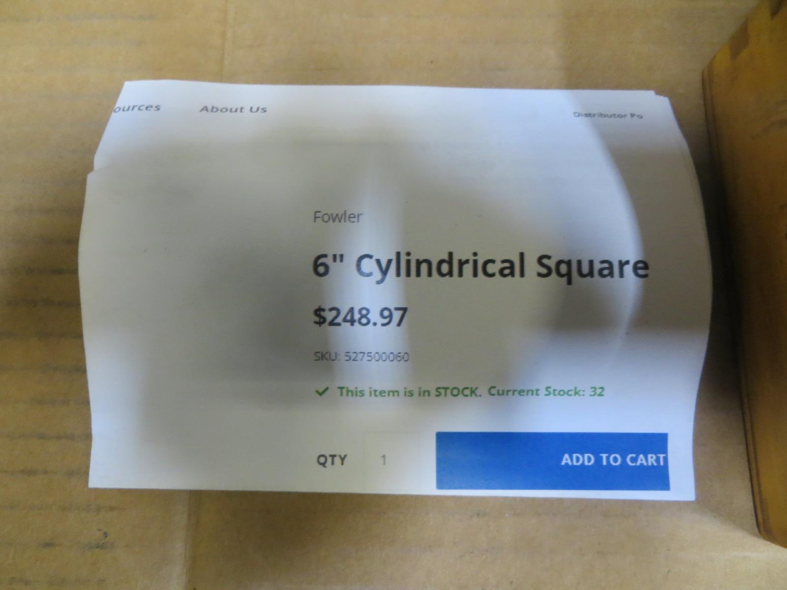 Lot 73: Fowler Cylindrical Square 6" Manufacturer: Fowler Model: Generic Main Unit Approx Weight: 0.00 lbs Main Unit Dimensions (in inches): Length: 0.00" Width: 0.00" Height: 0.00" Seller Company: Nilfisk Inc Seller Contact: Machinesused.com NilfiskAuction Phone: (763) 745-1166 Item Location: Nilfisk Inc, 9435 Winnetka Ave N , Brooklyn Park, MN 55445 Location Contact: Machinesused.com NilfiskAuction Phone: (763) 745-1166 Inspection Date & Time: Friday, November 7, 2025 9AM-4PM Dock Door: 12' x 14' Ground Level Door Removal Dates and Times: This item must be removed between Monday, November 17, 2025 and Wednesday, November 19, 2025