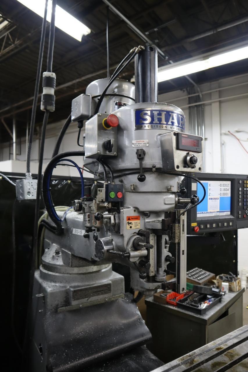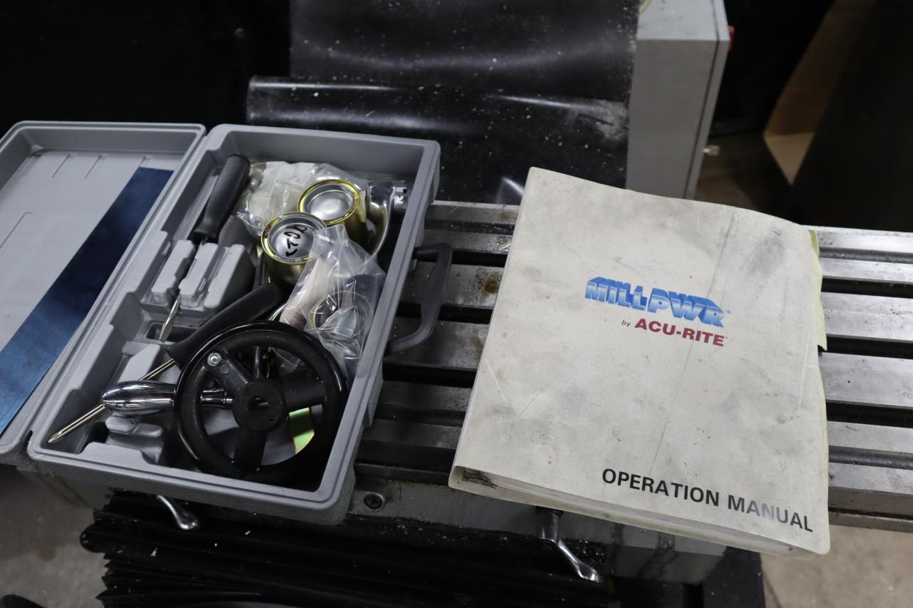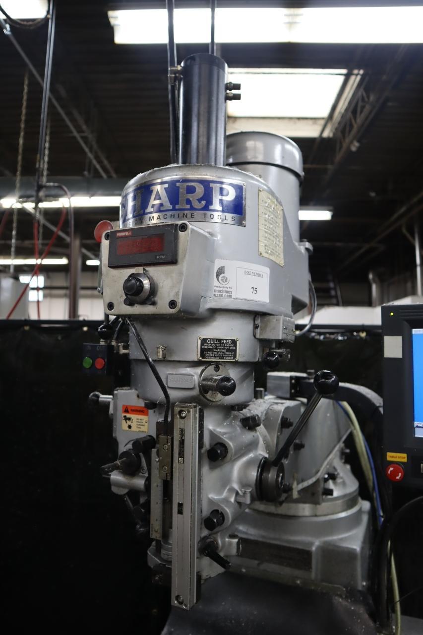 Lot 75: Sharp TMV-DVS Acu-Rite MillPWR 2-Axis CNC Vertical Knee Mill, Power Quill Feed, Power Drawbar Equipped With: 10"x50" Table, 60-4500 RPM Spindle, R8 Taper, Acu-Rite MillPwr Console 2-Axis CNC Control for X and Y-axis, Power Drawbar, Power Quill Feed and Handle, Variable Speed Digital Monitor, Power Feed on Knee, One Shot Lube, Maintenance Kit, MillPWR Manual Electrics: 220/440 Volt, 3 Phase Manufacturer: Sharp Model: TMV-DVS Year: 2011 Serial Number: 91003146 Main Unit Approx Weight: 0.00 lbs Main Unit Dimensions (in inches): Length: 77.00" Width: 74.00" Height: 94.00" Specs: Control: Acu-Rite MP2 3-Axis CNC Control Table Size: 10" x 50" Machine Travels (X/Y): 39"/16.3" Quill Travel: 5" Quill Feed (Inch/Rev): 0.0015, 0.003, 0.005 Quill Diameter: 3.37" Knee Travel: 15.3" Spindle To Table Distance: 5.37" - 16.9" Spindle Taper: R8 Spindle Speeds: 60 - 4500 RPM Spindle Drive: 3 HP Head Swivel Right to Left: 90 Head Tilt Front to Back: 45 Seller Company: Superior Machine, Inc. Seller Contact: Machinesused.com SuperiorAuction Phone: (763) 745-1166 Item Location: Superior Machine, Inc., 3501 Raleigh Avenue, St Louis Park, MN 55416 Location Contact: Machinesused.com SuperiorAuction Phone: (763) 745-1166 Inspection Date & Time: Thursday-Friday, November 13-14, 2025 8AM to 4PM Dock Door: 118"' x 142" Ground Level Door Removal Dates and Times: This item must be removed between Monday, December 1, 2025 and Thursday, December 4, 2025