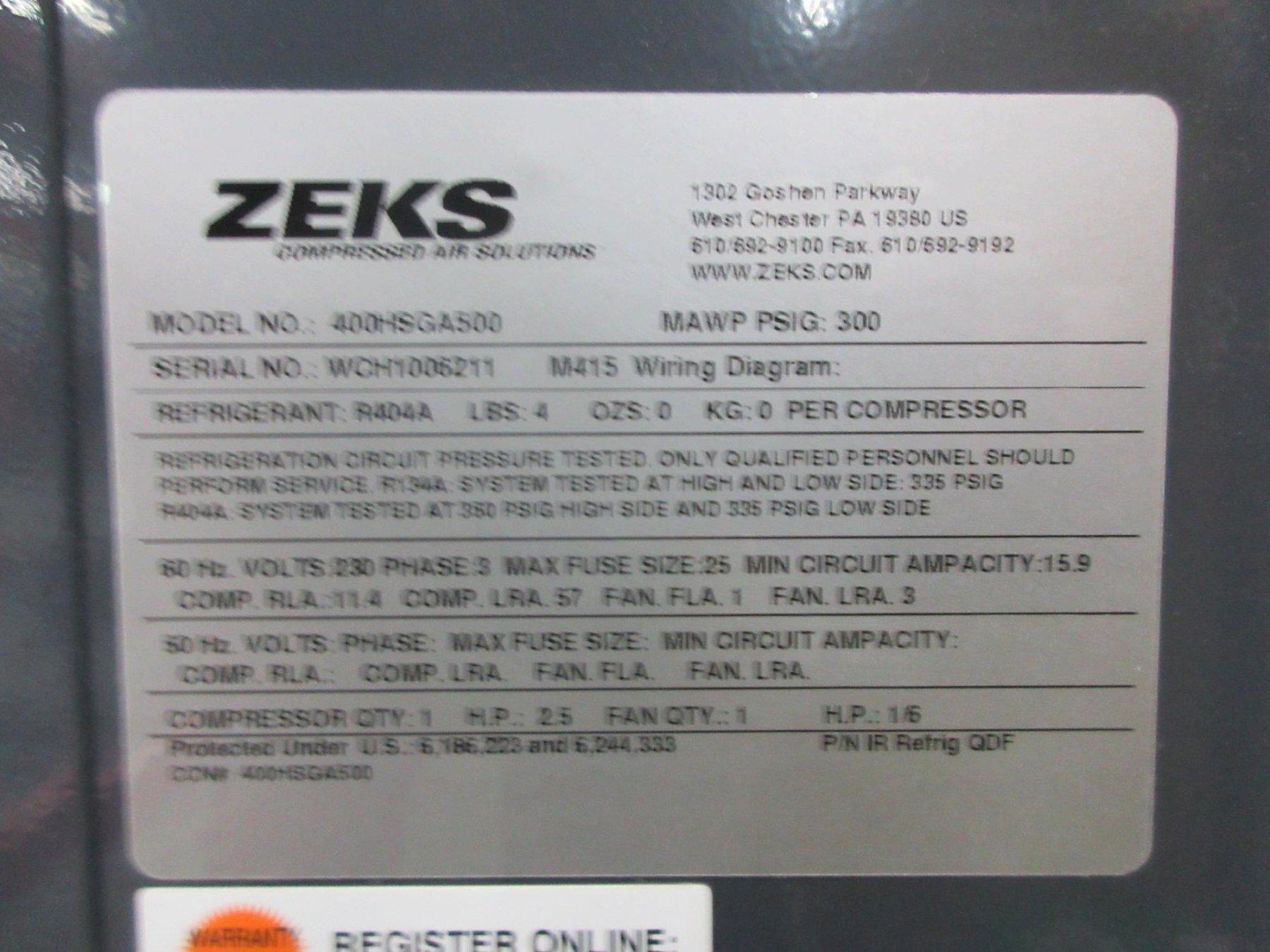 Lot 11: Zeks 400HSGA500 Heat Sink Refrigerant Air Dryer, 1HP Compressor Motor Equipped With: R404A Refrigerant, 300 Max PSI, True-Cycling, 1HP Compressor Motor Electrics: 230V 3 Phase Manufacturer: Zeks Model: 400HSGA500 Serial Number: WCH11006211 Main Unit Approx Weight: 0.00 lbs Main Unit Dimensions (in inches): Length: 0.00" Width: 0.00" Height: 0.00" Specs: Seller Company: Aljon Tool, Inc. Seller Contact: Machinesused.com Aljon Phone: (763) 745-1166 Item Location: Aljon Tool, Inc., 15700 28th. Ave. No., Plymouth, MN 55447 Location Contact: Machinesused.com Aljon Phone: (763) 745-1166 Inspection Date & Time: Thursday-Friday, February 19-20, 2026 9AM-4PM Dock Door: 12' x 14' H Door Ground Level Doors Loading Dock: Ground Level and Truck Cock Level Doors Removal Dates and Times: This item must be removed between Monday, March 2, 2026 and Friday, March 6, 2026