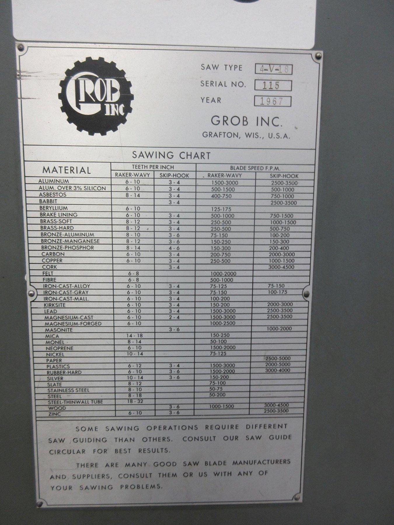 Lot 34: Grob 4V-18 Band Saw Equipped With: (2) Extra Blades, 3HP - 7.5Max, Tilting Table, Worklight Electrics: 3 Phase 240V Manufacturer: Grob Model: 4V-18 Year: 1967 Serial Number: 115 Main Unit Approx Weight: 1500.00 lbs Main Unit Dimensions (in inches): Length: 40.00" Width: 48.00" Height: 75.00" Specs: Throat: 18" Max Work Height: 12" Blade Size: 1/8" - 1" Wide X 150" Maximum Table Size: 28" x 24" Band Speeds: Infinitely Variable Speed 40-5,000 FPM Drive Motor: 3 HP Speeds: H and L, 1 and 2 Speed Selector Lever Blade Repair: Butt Welder, Grinder and Cutter Seller Company: Aljon Tool, Inc. Seller Contact: Machinesused.com Aljon Phone: (763) 745-1166 Item Location: Aljon Tool, Inc., 15700 28th. Ave. No., Plymouth, MN 55447 Location Contact: Machinesused.com Aljon Phone: (763) 745-1166 Inspection Date & Time: Thursday-Friday, February 19-20, 2026 9AM-4PM Dock Door: 12' x 14' H Door Ground Level Doors Loading Dock: Ground Level and Truck Cock Level Doors Removal Dates and Times: This item must be removed between Monday, March 2, 2026 and Friday, March 6, 2026