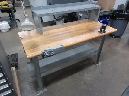 Lot 116: Butcher Block Top Work Bench with Upper and Lower Shelf, CAT40 Tool Vises Manufacturer: Generic Model: Generic Main Unit Approx Weight: 0.00 lbs Main Unit Dimensions (in inches): Length: 60.00" Width: 28.00" Height: 48.00" Seller Company: Superior Machine, Inc. Seller Contact: Machinesused.com SuperiorAuction Phone: (763) 745-1166 Item Location: Superior Machine, Inc., 3501 Raleigh Avenue, St Louis Park, MN 55416 Location Contact: Machinesused.com SuperiorAuction Phone: (763) 745-1166 Inspection Date & Time: Thursday-Friday, November 13-14, 2025 8AM to 4PM Dock Door: 118"' x 142" Ground Level Door Removal Dates and Times: This item must be removed between Monday, December 1, 2025 and Thursday, December 4, 2025
