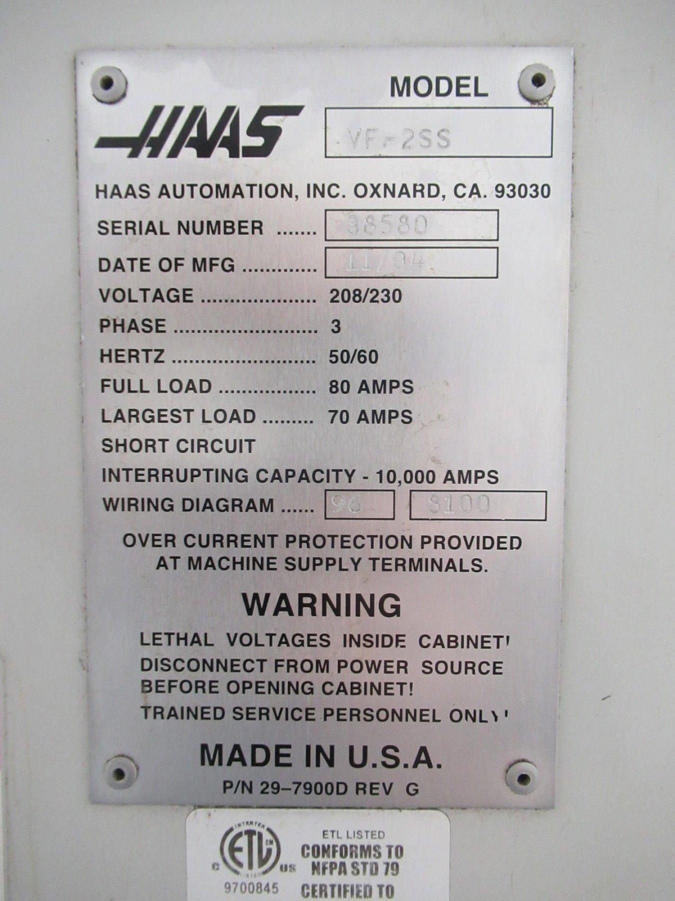 Lot 140: Haas VF-2SS CNC Vertical Machining Center Equipped With: Haas CNC Control, VOP-A Package, Thru-Spindle Coolant, High Intensity Lights, Remote Jog Handwheel, Floppy Disc Drive on Pendant, Programmable Coolant, Chip Conveyor, Shipping Bracket Electrics: 208/230 Volt, 3-phase Manufacturer: Haas Model: VF-2SS Year: 2004 Serial Number: 38580 Main Unit Approx Weight: 9000.00 lbs Main Unit Dimensions (in inches): Length: 112.00" Width: 94.00" Height: 102.00" Components: Coolant System / Pan: Length: 74.00" Width: 21.00" Height: 21.00" Specs: Machine Control: Haas 32 Bit CNC Table Size: 36" x 14" Machine Travels (X/Y/Z): 30" x 16" x 20" Spindle To Table Distance: 4" - 24" Table Capacity: 3,000 Lbs. Spindle Taper: Cat 40 Spindle Speeds: 0 - 12,000 RPM Transmission: Direct In-line Spindle Drive Rapid Traverse Rate (X/Y/Z): 1,400 IPM Tool Changer Style: Side-Mount, Twin Arm Tool Changer Capacity: 24 + 1 Tools Tool Change Time: 1.6 seconds Max Tool weight: 12 Lbs. Spindle Drive: 30 HP Vector Drive Seller Company: Tesla Seller Contact: Machinesused.com DecemberMultiShop Phone: (763) 745-1166 Item Location: Tesla, 2410 Niagara lane N, Plymouth, MN 55447 Location Contact: Machinesused.com DecemberMultiShop Phone: (763) 745-1166 Inspection Date & Time: By Appointment Normal Business Hours Monday-Friday Removal Dates and Times: This item must be removed between Tuesday, December 2, 2025 and Friday, December 12, 2025