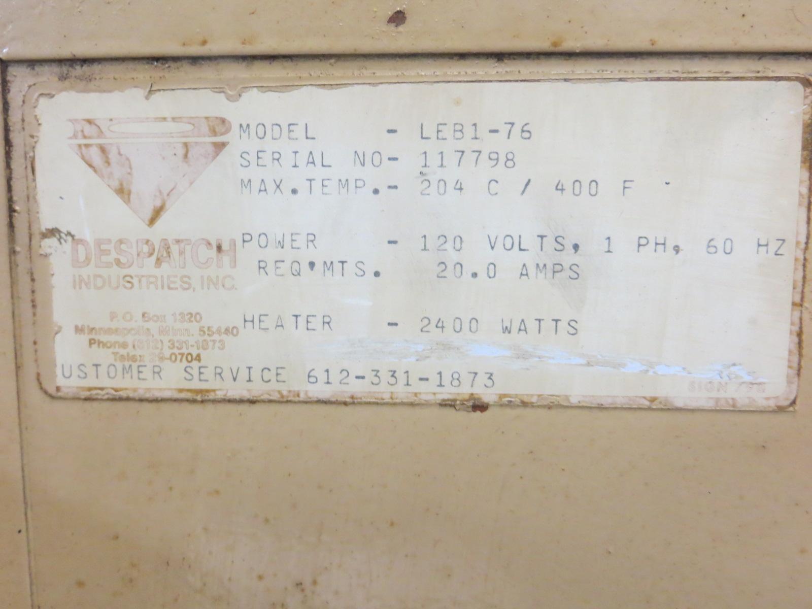 Lot 75: Despatch LEB1-76 Benchtop Convection Oven Equipped With: 204 C / 400 F FMaximum Temperature, 30"LR x 18"FB x 24"H Inside Dimensions, 2400 Watt Heater Electrics: 120 Volts, Single Phase Manufacturer: Despatch Model: LEB1-76 Serial Number: 117798 Main Unit Approx Weight: 0.00 lbs Main Unit Dimensions (in inches): Length: 34.00" Width: 22.00" Height: 36.00" Seller Company: Spirit River Machine Seller Contact: John Westling Phone: (612) 282-9797 Item Location: Spirit River Machine, 705 S Old Hwy 18, Princeton, MN 55371 Location Contact: John Westling Phone: (612) 282-9797 Inspection Date & Time: By Appointment Normal Business Hours Monday-Friday Dock Door: 14' x 14' Large Door Loading Dock: Ground Level Removal Dates and Times: This item must be removed between Tuesday, December 2, 2025 and Friday, December 12, 2025
