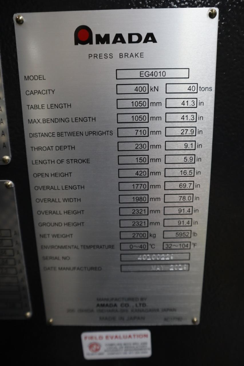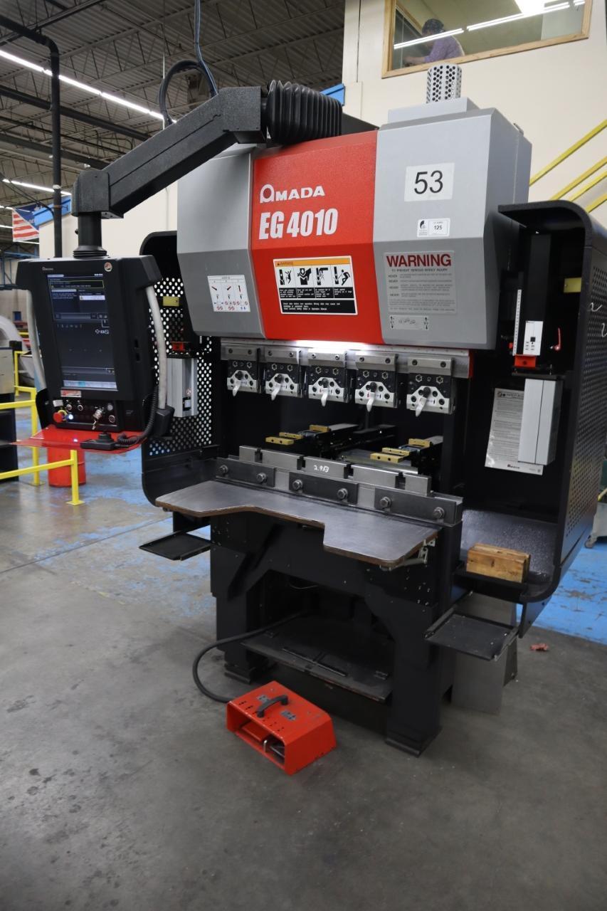 Control: Amada AMNC 3i CNC COntrol Tonnage Capacity: 44 Tons Bendin Length: 41.3" Distance Between Frames: 27.9" Stroke Length: 5.9" Max Open Height: 16.5" Approach Speed: 8.7 IPS Bend Speed: 1 IPS Return Speed: 8.7 IPS D-Axis Tilt: +/- .08" Throat Depth: 9.1" Backgauge Stroke : 11.8" (Max 23.6"Distance)Use Step Gauging Backgauge Stroke (Z-Axis): 2-8" Backgauge Speed (L-Axis): 2,362 IPM Backgauge Speed (Y-Axis): 2,362 IPM Main Servo Drive Motor: (2) 1.8+.85 KW Servo Motors for Ram Backgauge Speed (Z-Axis): 787 IPM Description: The Amada EG-4010 Electric Press Brake delivers high-speed precision bending with energy-efficient servo drive technology. Buy this used Amada EG-4010 from Machinesused.com—ideal for accurate, repeatable forming in compact production spaces. Equipped With: AMNC 3i CNC Control with Touchscreen, 5-Axis Backgauge, Servo Down-Acting Rams, Light Curtains, Remote Foot Trip, (2) Backgauge Fingers, Tall Lower Die Holders, Ram Clamps, Remote Jog Handwheel Electrics: 200 Volt, 3 Phase |
