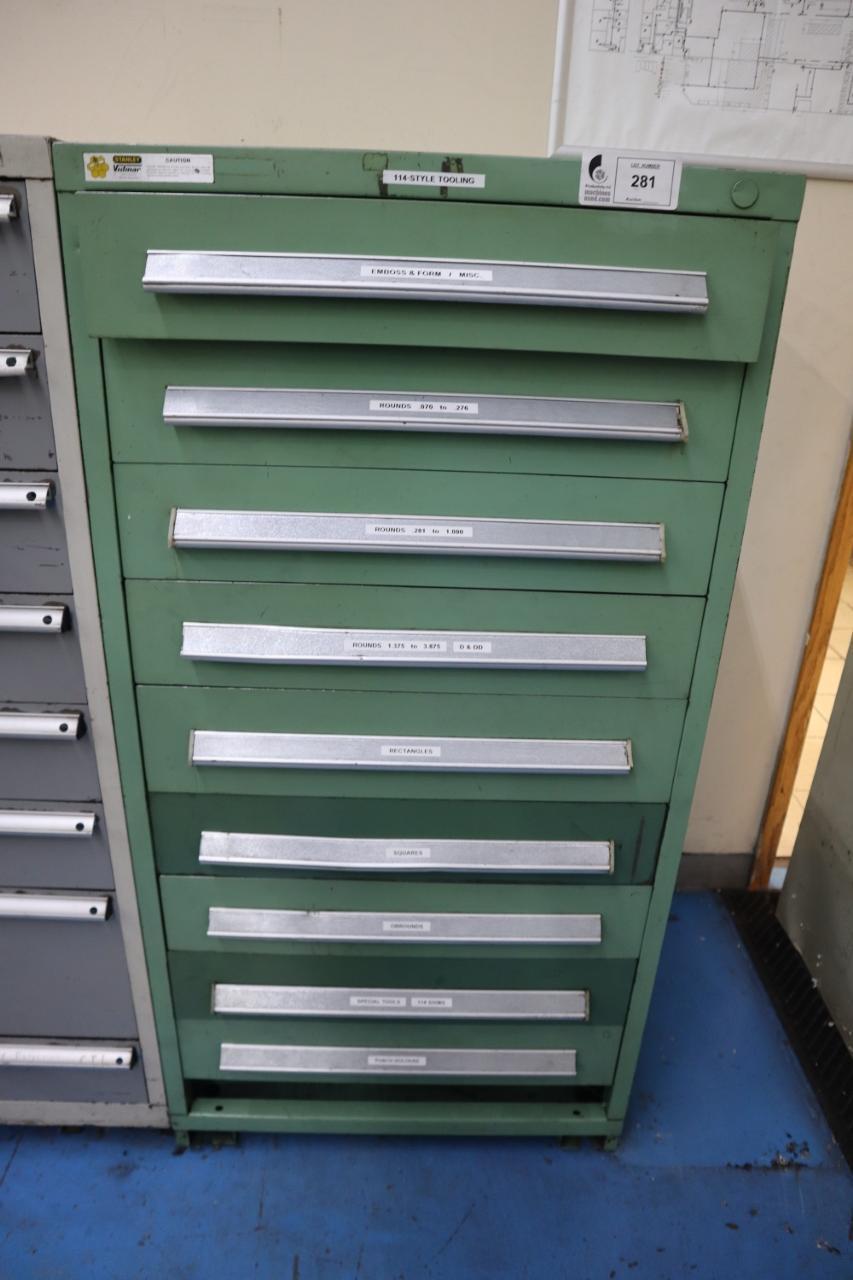 Lot 281: 114 Style Turret Punch Tooling in Stanley Vidmar 9 Drawer cabinet Manufacturer: Generic Model: Generic Main Unit Approx Weight: 0.00 lbs Main Unit Dimensions (in inches): Length: 30.00" Width: 29.00" Height: 59.50" Seller Company: Aljon Tool, Inc. Seller Contact: Machinesused.com Aljon Phone: (763) 745-1166 Item Location: Aljon Tool, Inc., 15700 28th. Ave. No., Plymouth, MN 55447 Location Contact: Machinesused.com Aljon Phone: (763) 745-1166 Inspection Date & Time: Thursday-Friday, February 19-20, 2026 9AM-4PM Dock Door: 12' x 14' H Door Ground Level Doors Loading Dock: Ground Level and Truck Cock Level Doors Removal Dates and Times: This item must be removed between Monday, March 2, 2026 and Friday, March 6, 2026
