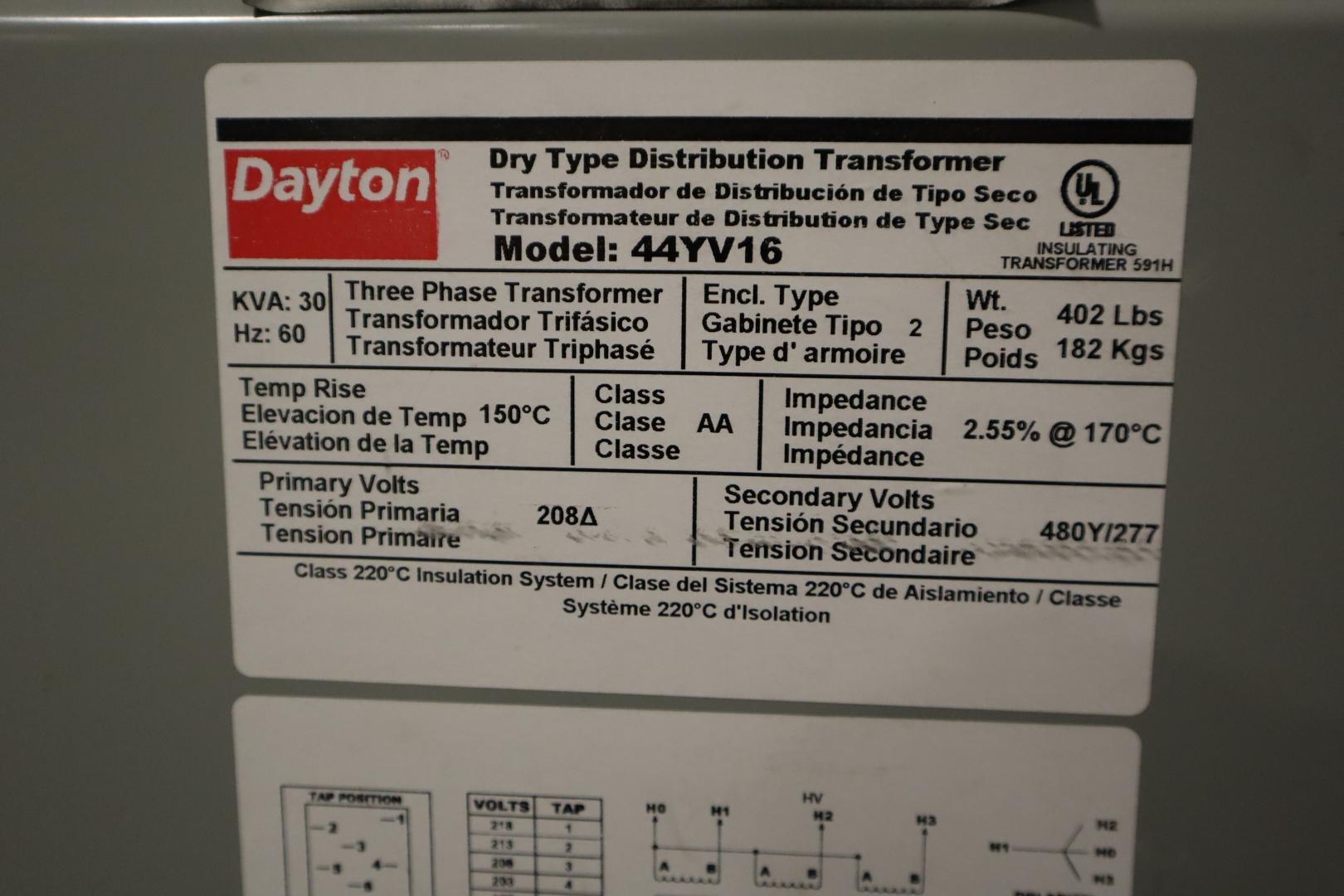 Lot 42: Dayton Dry Type Distribution Transformer 44YV16 Electrics: Kva 30, Primary Volts 208. Secondary Volt 480Y/277 Manufacturer: Dayton Model: 44YV16 Main Unit Approx Weight: 402.00 lbs Main Unit Dimensions (in inches): Length: 25.00" Width: 21.00" Height: 37.00" Specs: Seller Company: Tech Financial Services, A Division of Five-Lakes Financial Seller Contact: Machinesused.com December Multishop Phone: (763) 745-1166 Item Location: Machinesused.com, 2410 Niagara Lane N., Plymouth, MN 55447 Location Contact: Machinesused.com December Multishop Phone: (763) 745-1166 Inspection Date & Time: By Appointment Normal Business Hours Monday-Friday Removal Dates and Times: This item must be removed between Tuesday, December 2, 2025 and Friday, December 12, 2025