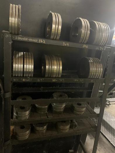 Stock # 14583 6" Coil to Coil Edging Line Thickness Range: .020" - .340" Coil Width: 6" -1" Coil Capacity: 6,000# Coil ID: 20" Coil OD: 72" Line Speed: 285 FPM Edging #5 Deburred & #4 Full Round Complete Line with: Mandrel Uncoiler 3 Leaf Hydraulic Expansion Powered Hold Down Roll Sliding Base Air Clutch & Brake Feed Up Drive Edging Unit & 2HI Mill Entry Pass Line Roll 5 Roll Flattener Entry Set of Edge Guides 2 Sets of Driven Edging Dies with 30 HP DC Motor 2 HI Rolling Mill 9" Roll Face x 6.25" Roll Diameter Roller Bearing Rolls Hydraulic Screw Downs Volmer Gauges VMF 3/1 Gauge Control Entry & Exit End Coders Entry & Exit Pass Lines Rolls 40 HP DC Mill Drive Exit Crop Shear Exit Feed-Up Table and Pressure Roll Recoiler Hydraulic Push Off Sliding Base Hydraulic Drum 30 HP DC Drive Nematron Digital Readouts Smoreg Digital Drives Spare Rolling Mill Rolls Spare Edging Line Central Hydraulic Unit Complete Line **Temporary Specifications Subject to Revisions** **PRICE QUOTED AS IS WHERE IS SUBJECT TO PRIOR SALE** **ALL SPECIFICATIONS ARE SUBJECT TO VERIFICATION** |