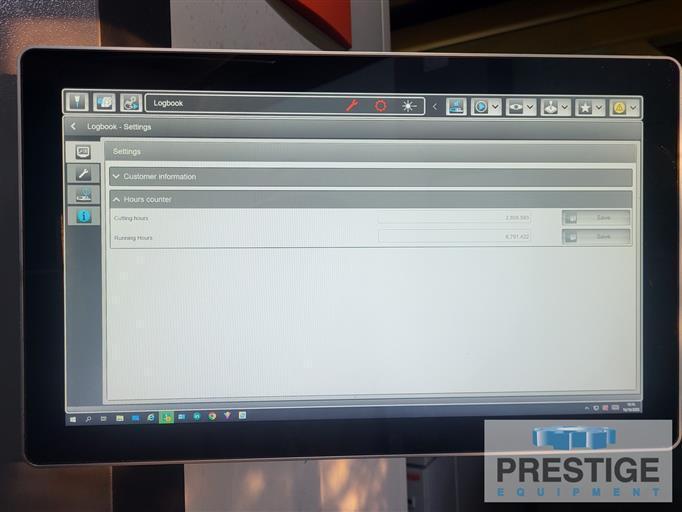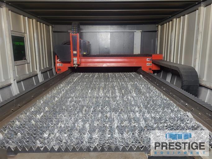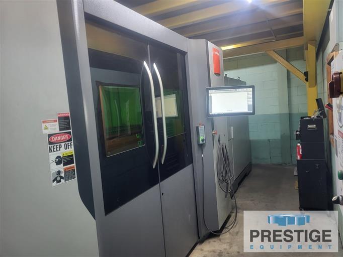 Maximum Laser Output 6000 Watts Maximum Cutting Thickness (Steel) 1" Maximum Cutting Thickness (Stainless).. 1.18" 1.18" Maximum Cutting Thickness (Aluminum) 1.18" X-Axis Cutting Area.................... 122" 122" Y-Axis Cutting Area 60" Z-Axis Cutting Area 4" Positioning Accuracy +/- .004" Max. Work Piece Weight 2,425 Lbs. Max. Pos. Speed Parallel Axis X,Y 3,937 IPM Max. Positioning Speed Simultaneous.... 5,511 IPM 5,511 IPM Overall Length of Machine 413" Overall Width of Machine 272" Approximate Shipping Weight 26,015 Lbs. Equipped With: ByVision Control with Touchscreen Fiber 6000 Laser Source Automatic 40 Position Nozzle Changer Automatic Pallet Shuttle Table Chiller Dust Collector NOTE: Inspect In Plant Under Power Low Hours, Only 2,809 Cutting Hours, Machine is in Excellent Condition |